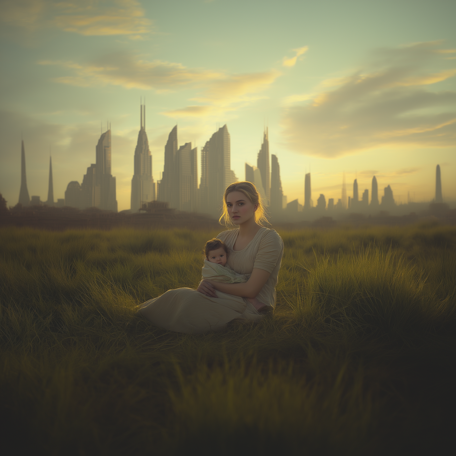 A serene young woman sits in a grassy meadow at dawn, cradling a baby in her arms. The calmness of her expression contrasts with the dystopian city skyline shrouded in morning mist behind her.