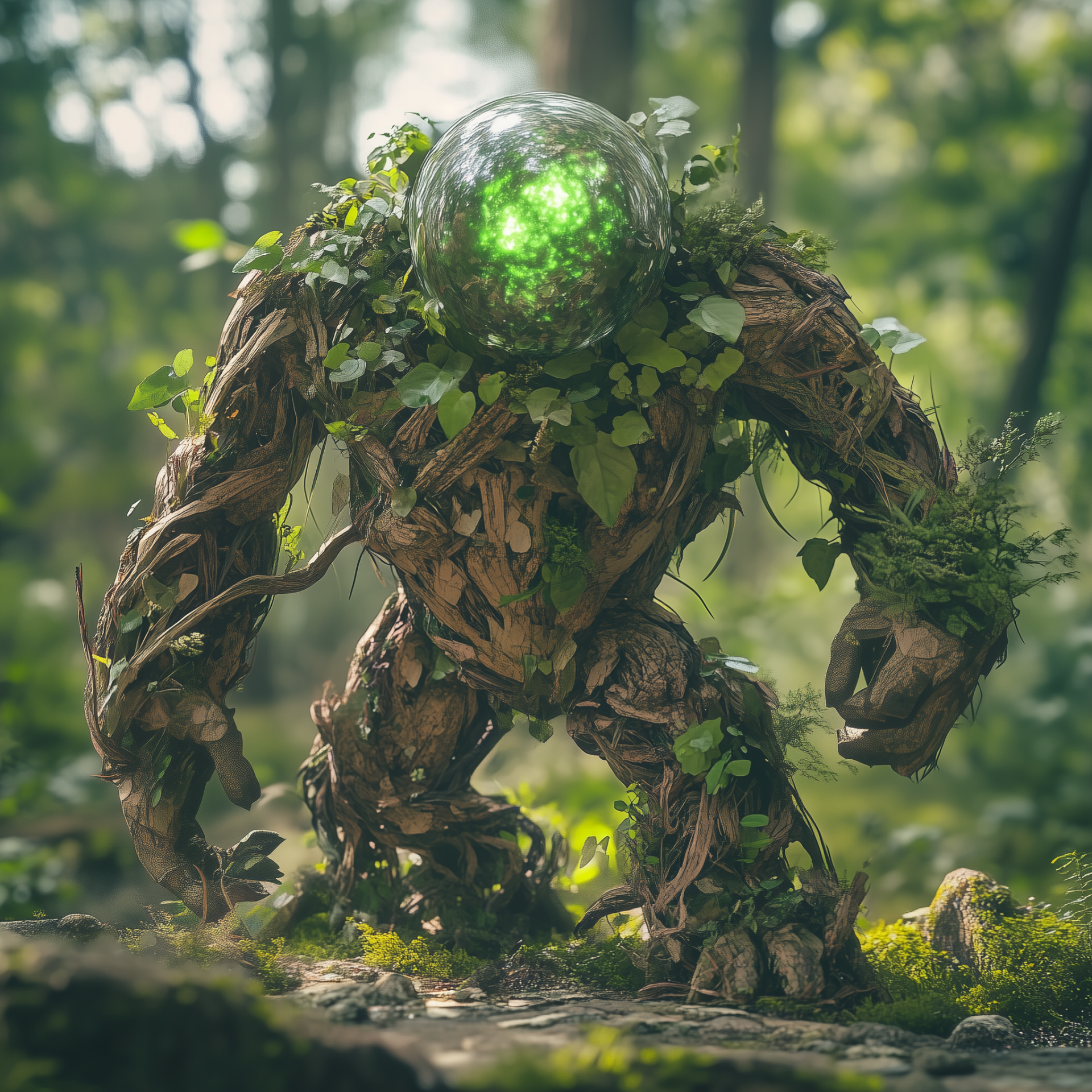 This illustration depicts a towering golem standing at 6 feet 10 inches, crafted from a blend of earth, wood, and plant materials. The golem exudes a sense of strength and natural harmony, with intricate details of foliage and bark seamlessly integrated into its structure.