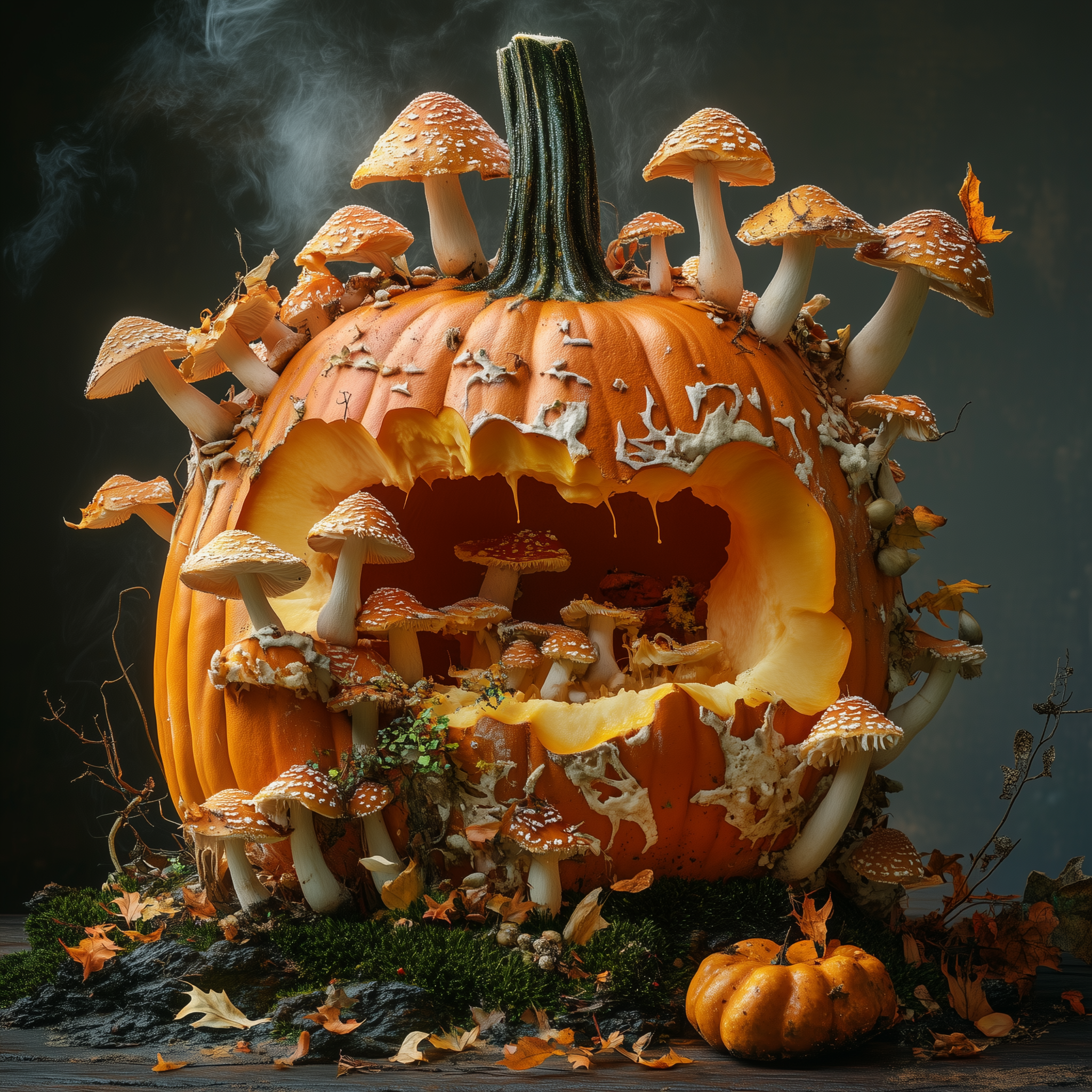 This image depicts realistic mushrooms emerging from the remnants of partially smashed pumpkins. The contrast between the earthy tones of the mushrooms and the vibrant orange of the pumpkin creates a striking visual.