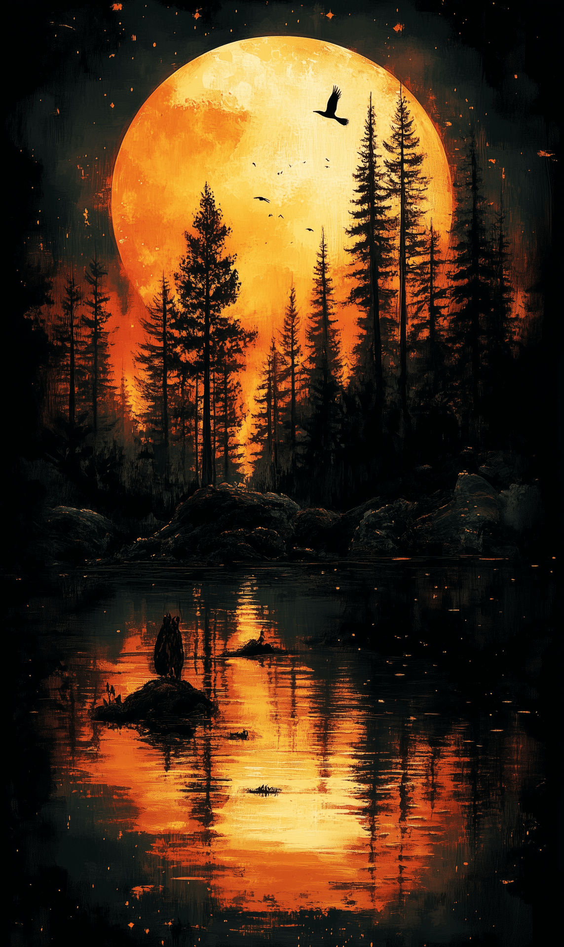 The image features a detailed illustration of an owl's head, showcasing its striking features and eyes. Below, a silhouette of pine trees creates a layered landscape, adding depth and contrast to the artwork.