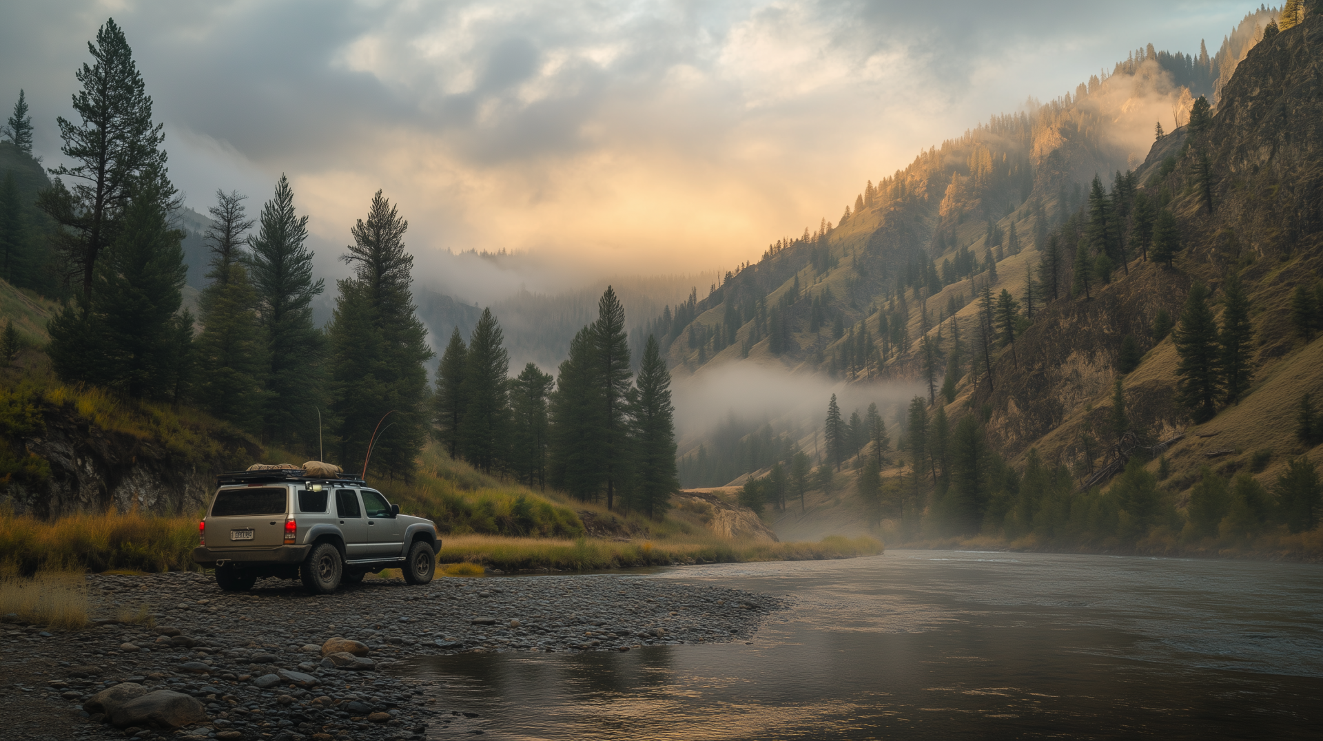This image captures a breathtaking wide-angle view of a serene river landscape at dawn. The rugged beauty of the Idaho wilderness is highlighted by mist rising off the water, set against dramatic mountains and a moody sky.