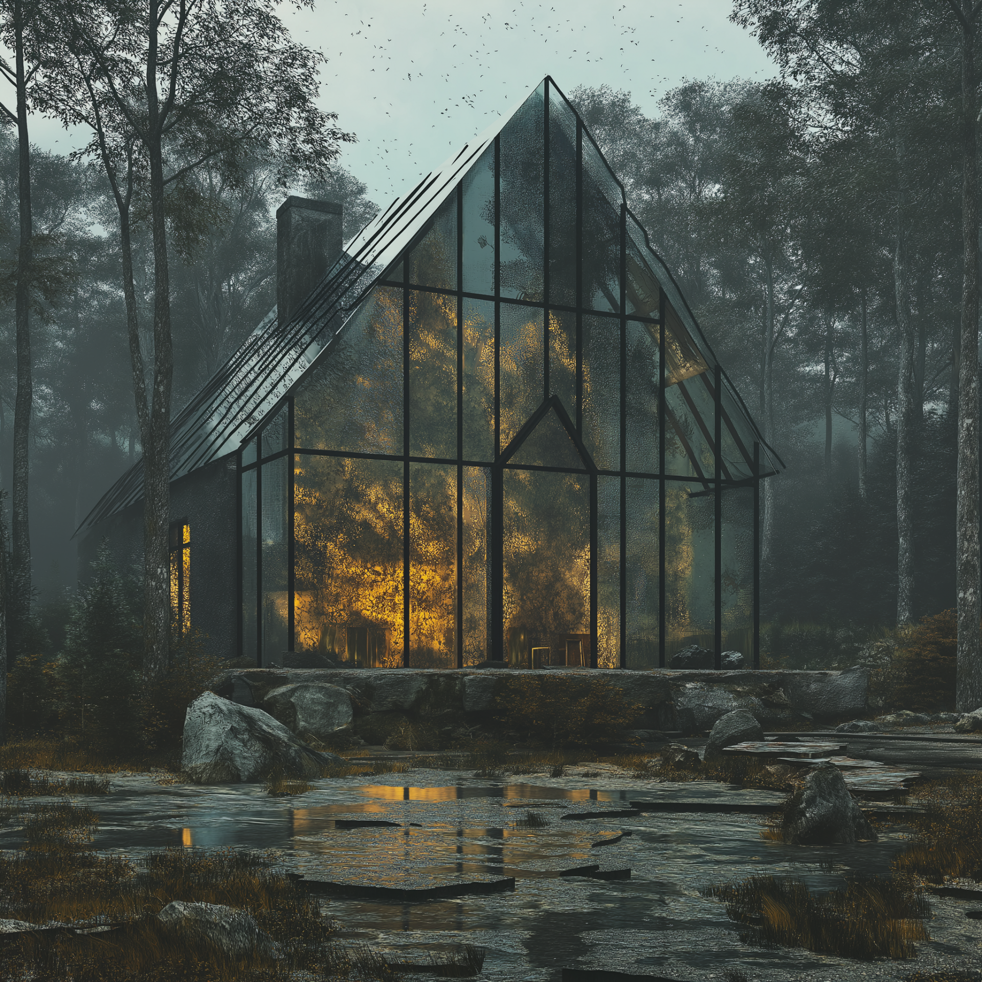 The image depicts a glass house nestled in a wooded environment, with hail cascading down, causing cracks to form in the structure. The scene is rendered in the expressive style of Hudson River School painting, evoking a sense of nature's power and beauty.