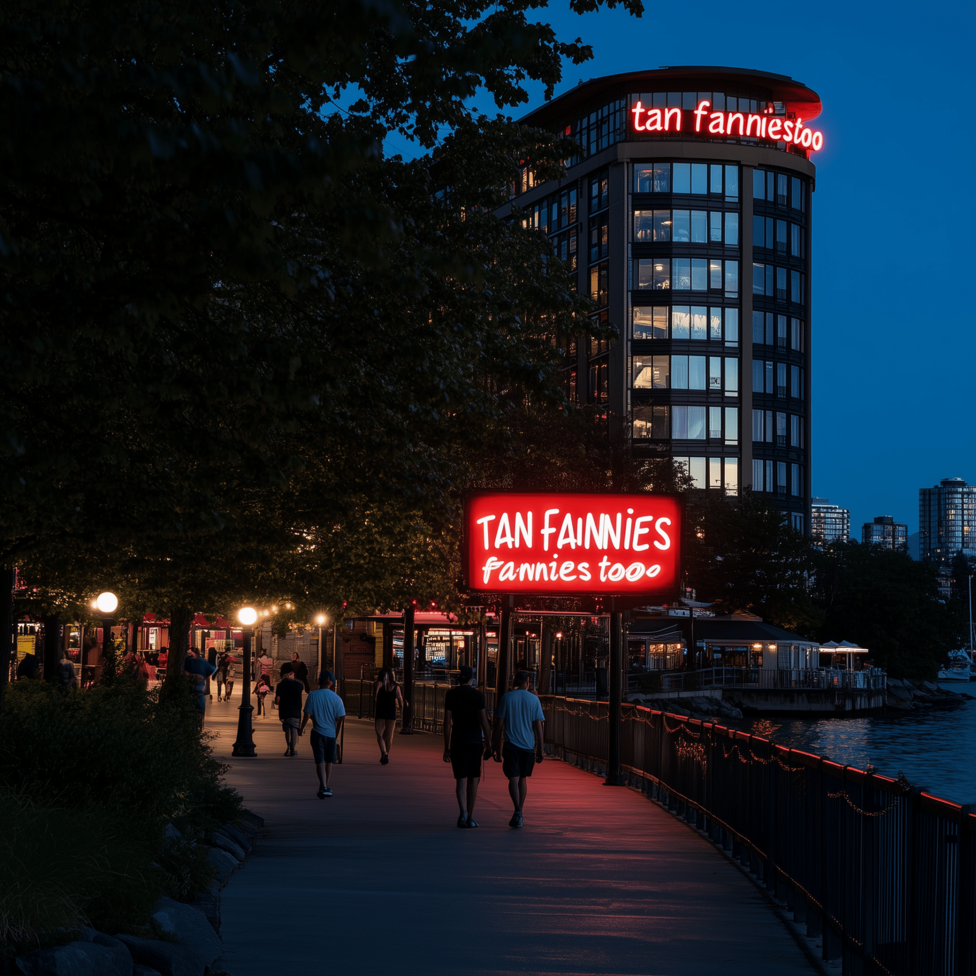 This photograph captures a serene waterfront walking path illuminated at night. Tall trees line the path, creating a peaceful atmosphere as people stroll along with a vibrant building glowing in the background.