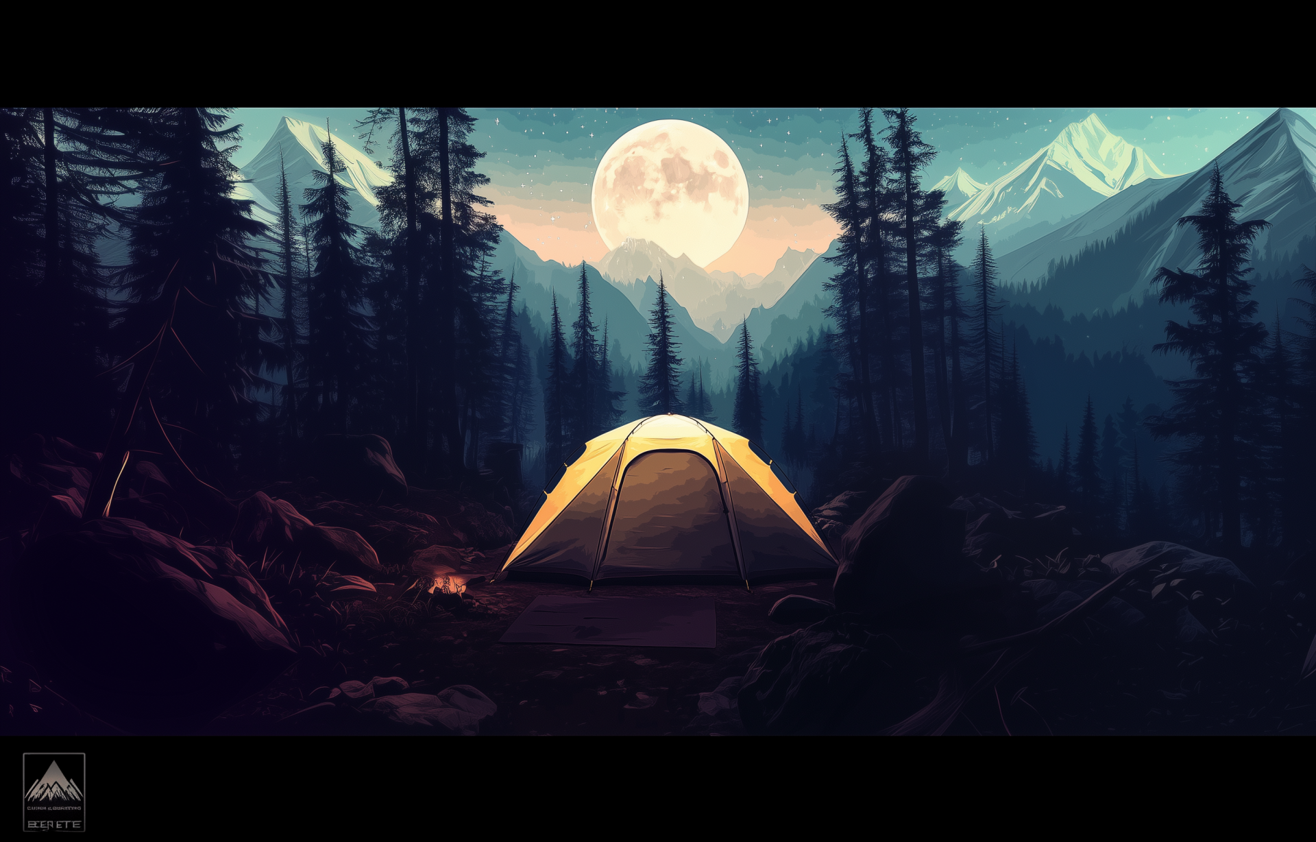The image captures a serene nighttime scene in the forest, highlighted by majestic mountains and a bright full moon. A tent is pitched in the foreground, surrounded by rich blues and purples that create a calm and inviting atmosphere.