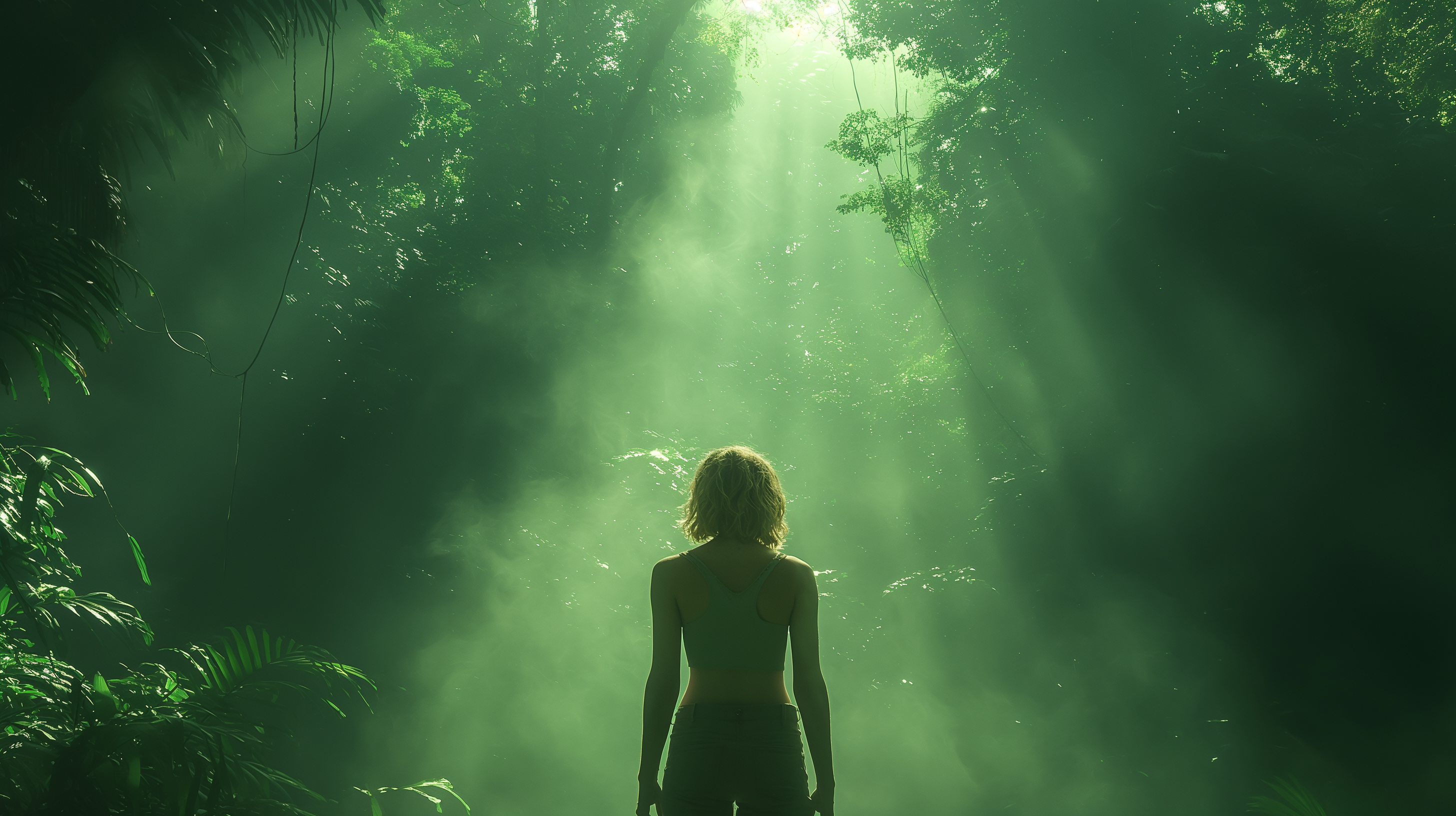 A mesmerizing illustration of the vast Amazon rainforest interior, where towering trees disappear into darkness above a young woman in a green summer dress. The dense canopy filters minimal light, creating a mystical atmosphere filled with hidden life and bioluminescent elements.