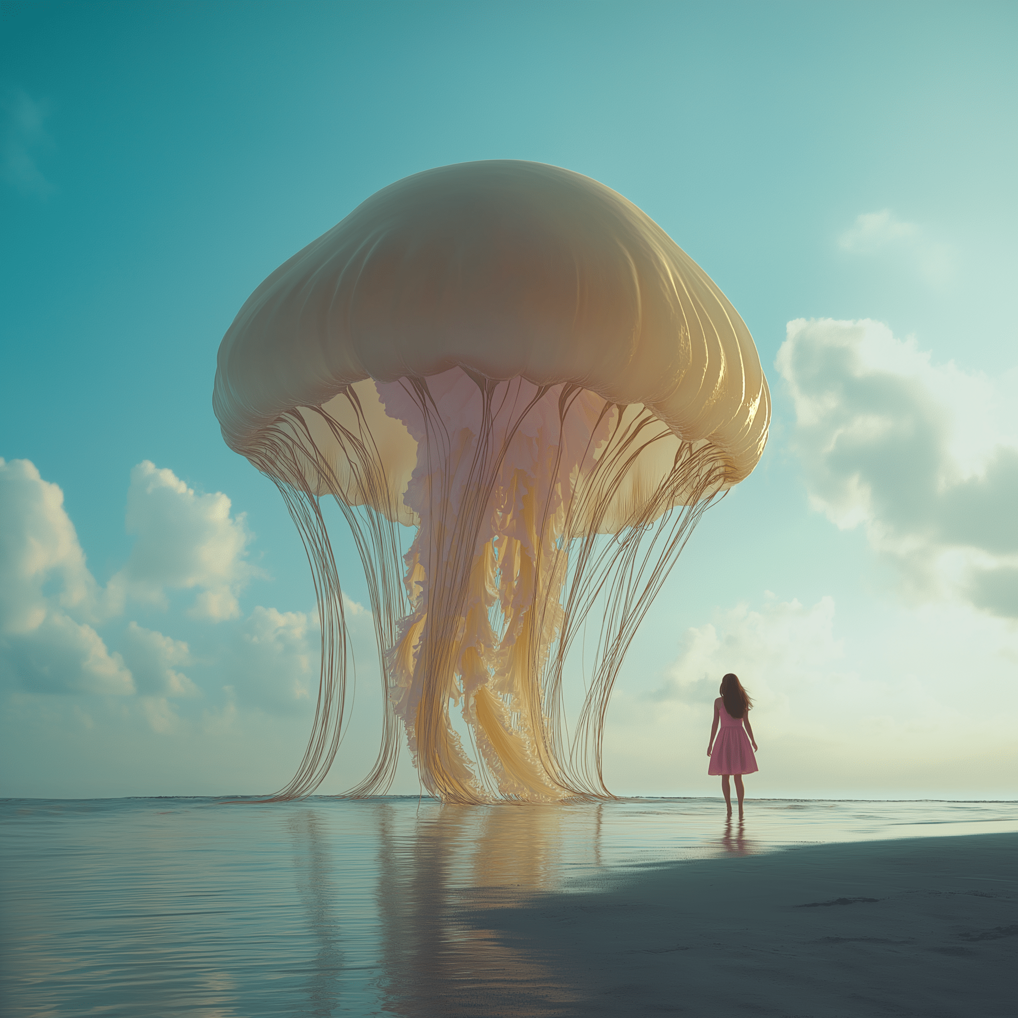 The image showcases a woman walking gracefully on a sandy shore, her figure illuminated by the soft glow of a massive jellyfish hovering above her. The water along the coastline reflects the surreal ambiance, creating an ethereal atmosphere that enchants the viewer.