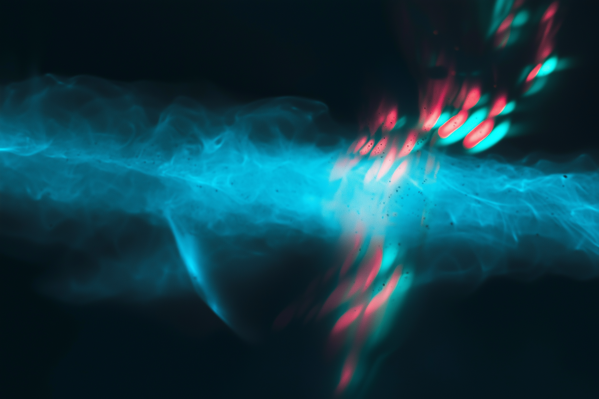 This image features an abstract composition dominated by blue neon lights set against a deep black background. The glowing lights appear in motion, creating a dynamic and slightly blurry effect that adds a sense of depth and energy to the scene.