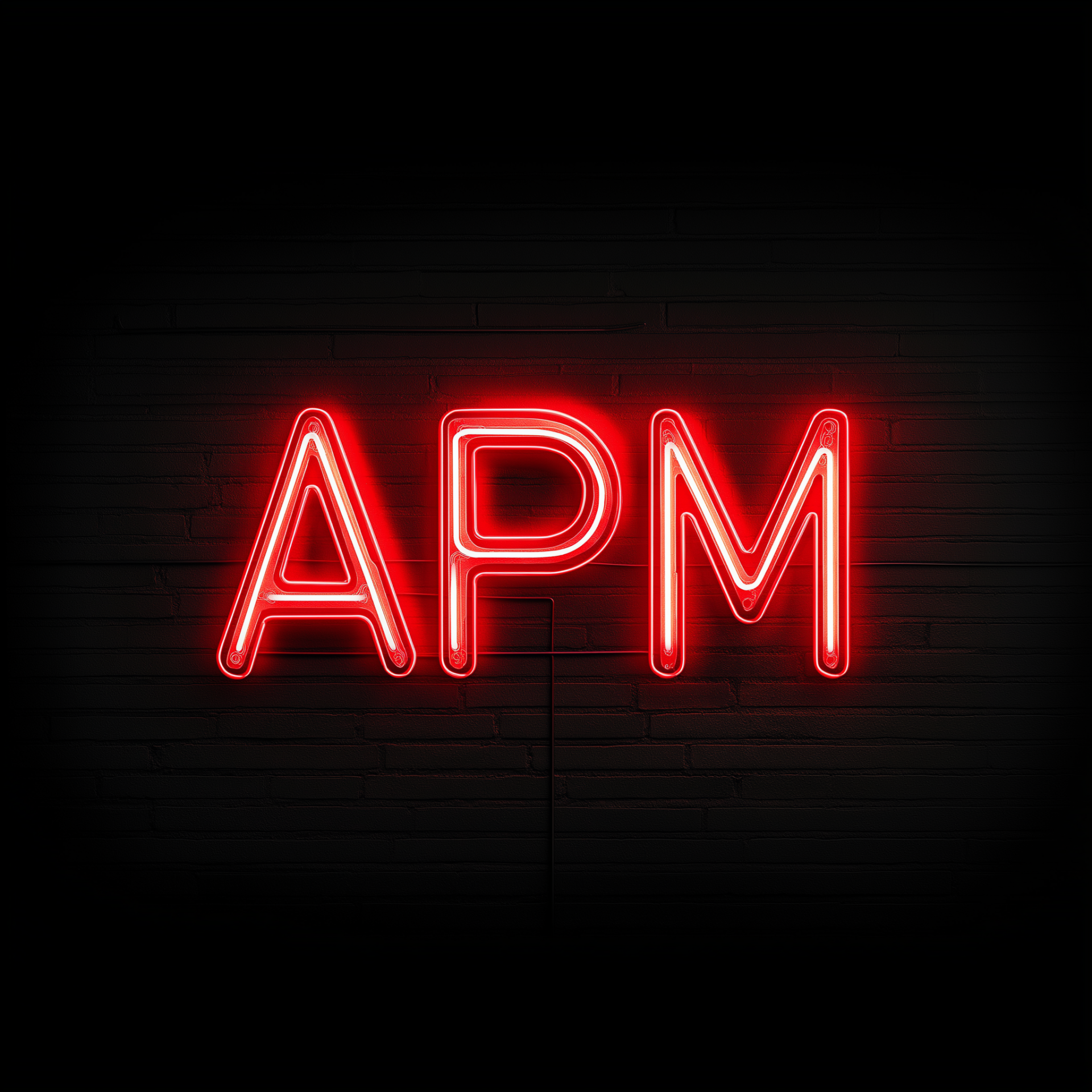 The image features the letters 'APM' illuminated in a vibrant red neon style, set against a solid black background. The contrast between the bright neon and the dark backdrop creates a striking visual impact.