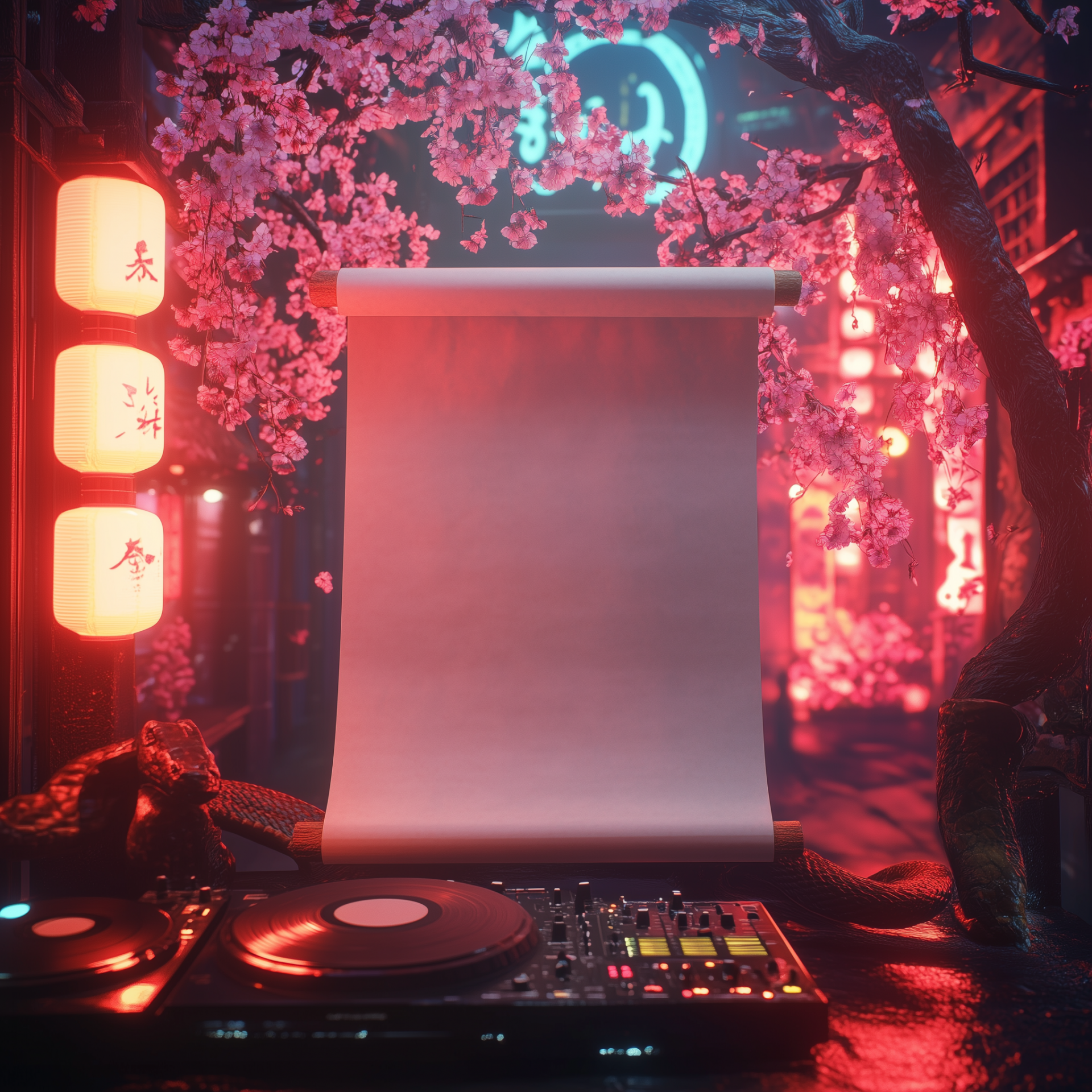 The image features a blank open Chinese scroll prominently displayed on top of cutting-edge CDJs, surrounded by vibrant neon lights. The play of volumetric lighting creates a mystical atmosphere enhanced by decorative elements like snakes and cherry blossoms.