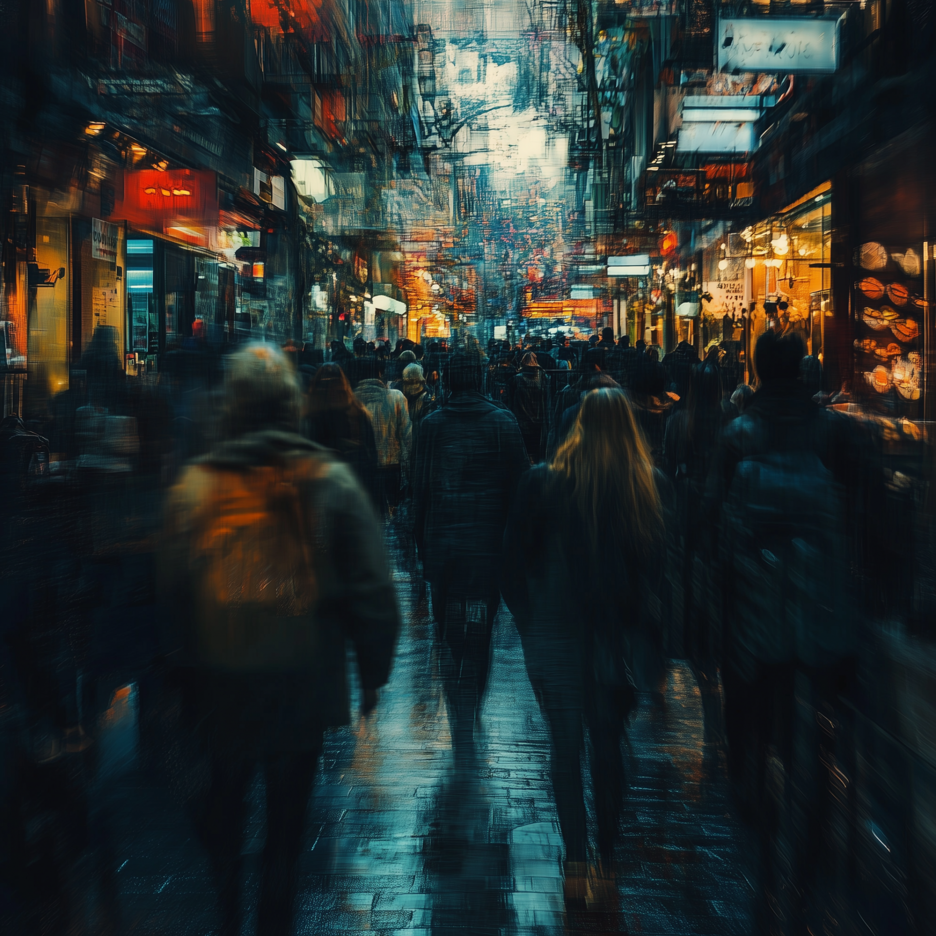 A vibrant scene depicting a bustling group of people leisurely walking in a futuristic, dreamy setting. The atmosphere is enhanced by a cyberpunk aesthetic, showcasing bright neon lights and a lively urban environment.