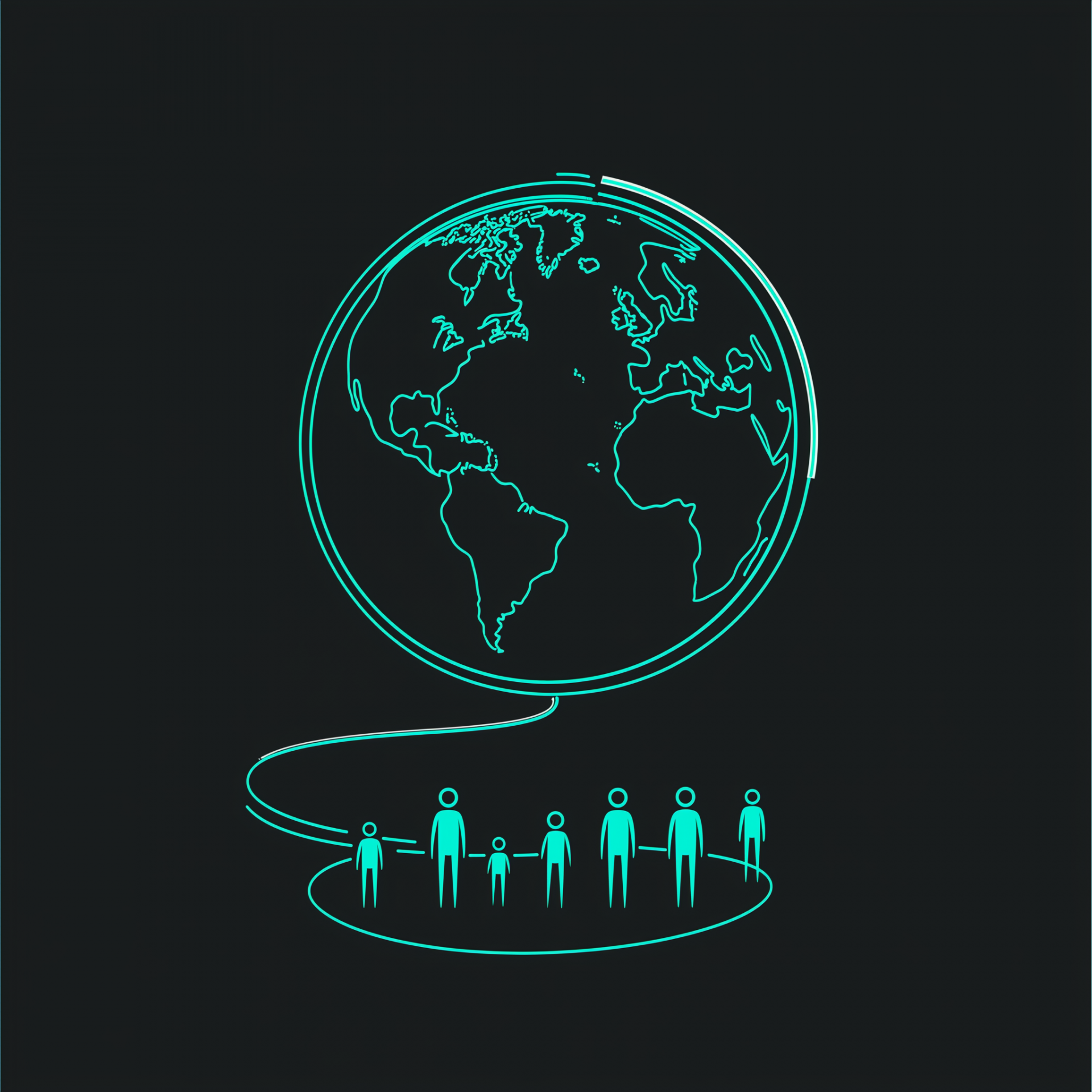 This illustration features a simplistic, single-line design of a world with a lasso encircling it. The turquoise neon line contrasts sharply against a plain background, creating a modern and captivating look.
