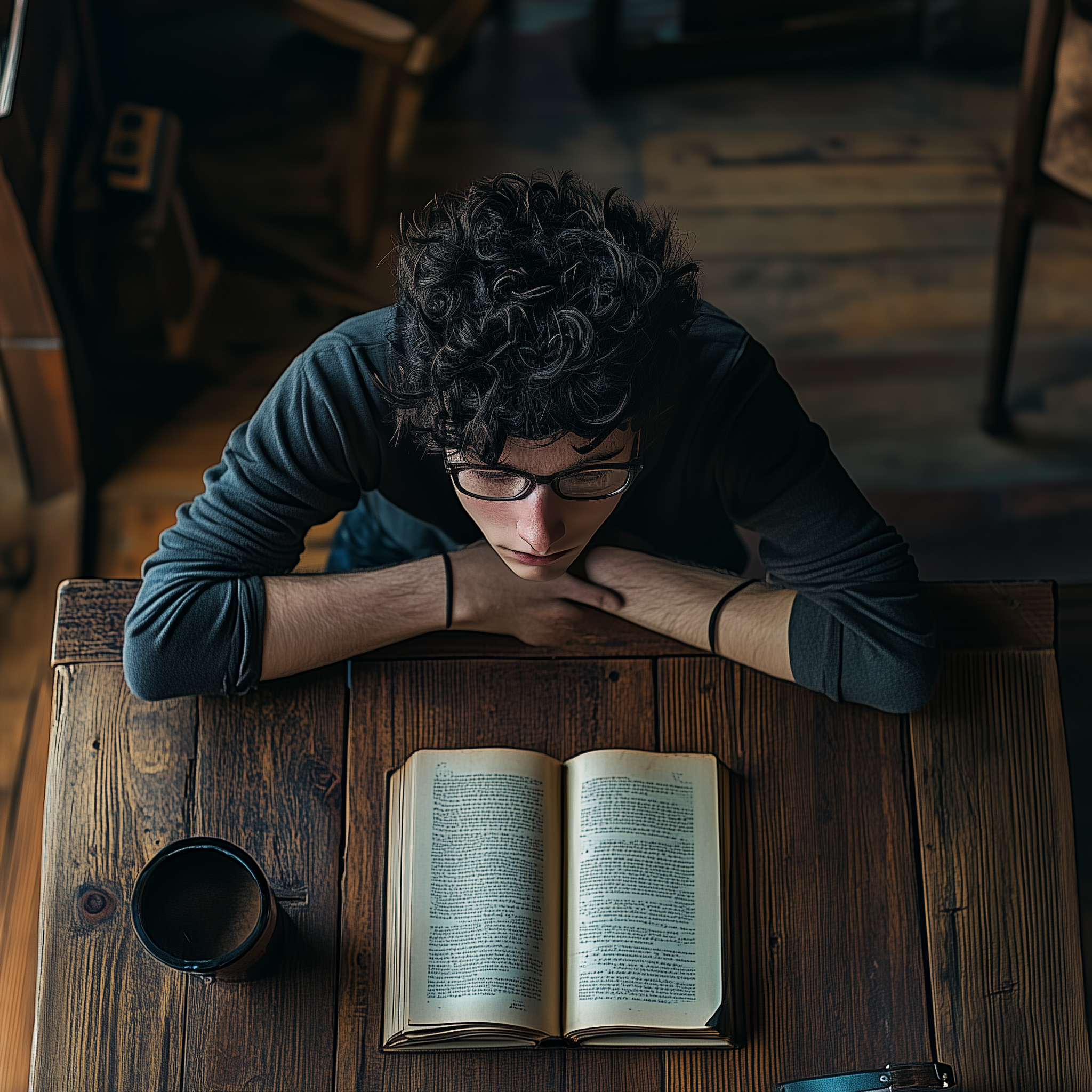 The image captures a bird's eye view of a young boy with curly black hair and glasses, engrossed in a book. He stands at a mahogany table, which adds a warm tone to the scene, creating an atmosphere of quiet concentration and intellectual curiosity.