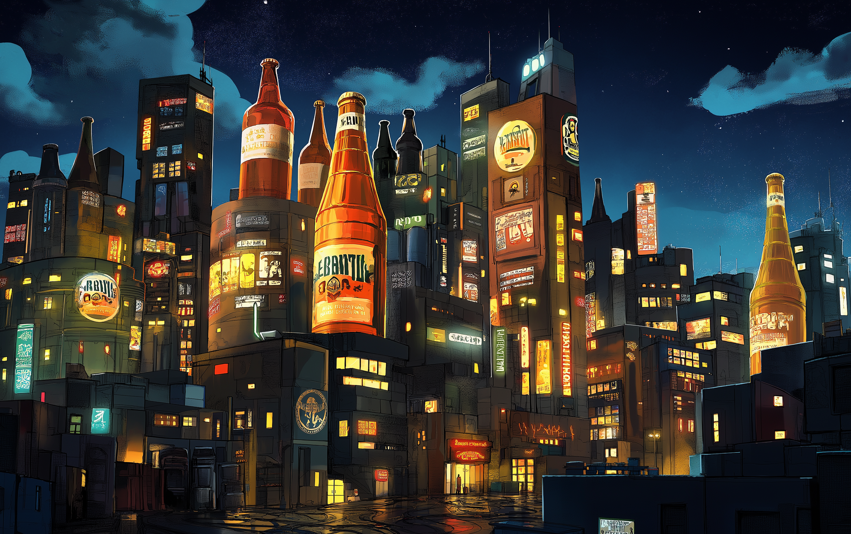 A vibrant night cityscape featuring buildings designed to resemble beer bottles and cans. The colorful lights reflect off the uniquely shaped structures, creating a lively and whimsical atmosphere.