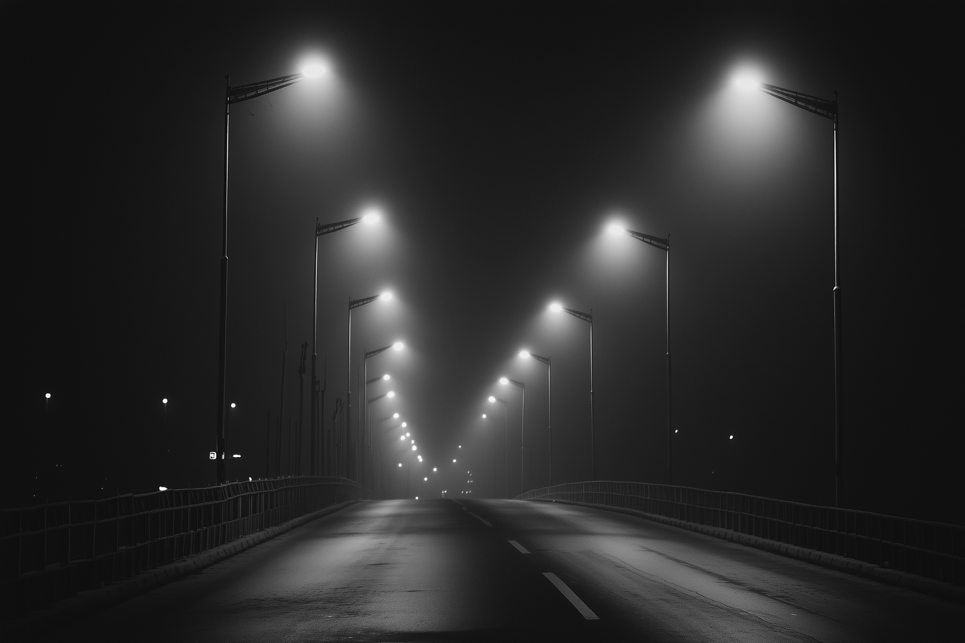 This black and white photo captures the essence of a quiet city street illuminated by numerous street lights. The low camera angle provides a dramatic perspective, showcasing the depth and tranquility of the urban environment at night.