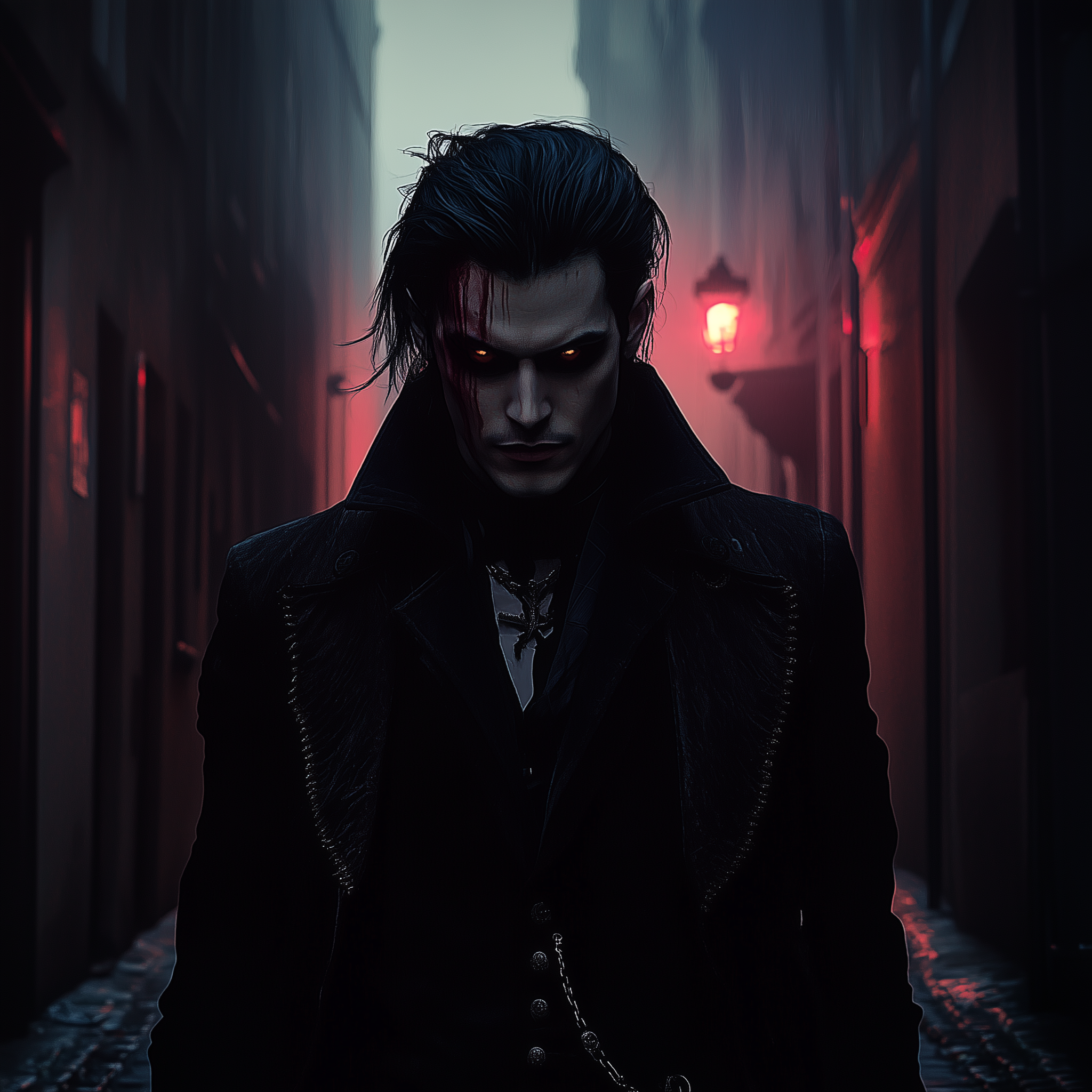 This image captures a lone individual standing in a dimly lit alleyway at night. The atmosphere is moody and mysterious, with shadows casting dramatic shapes and the faint light illuminating the surroundings.
