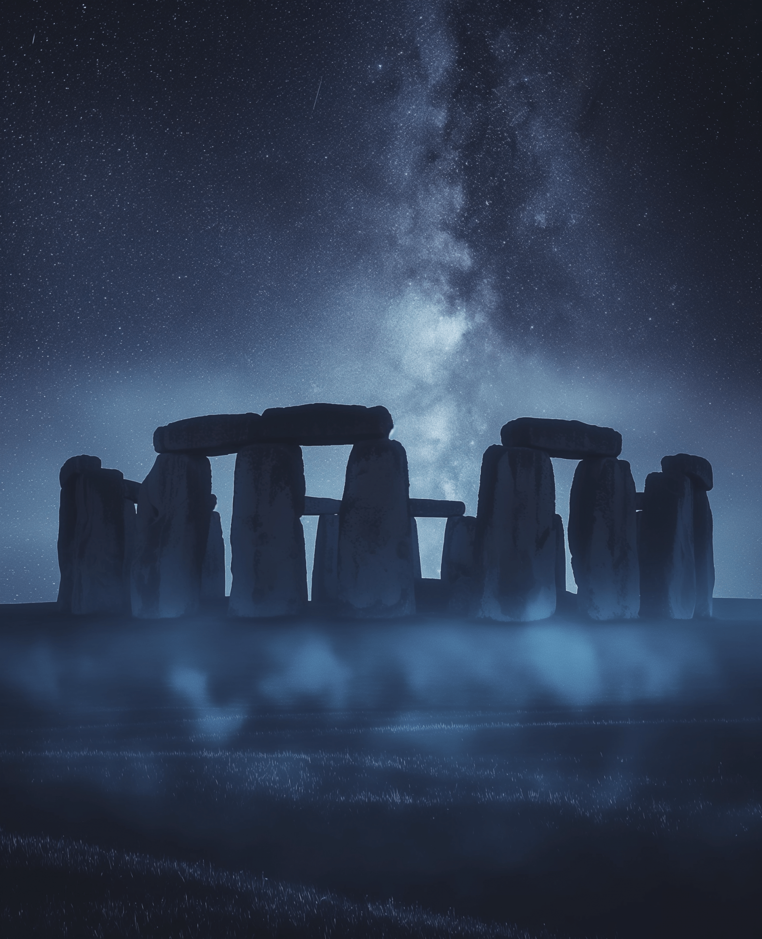 This image captures the ancient monoliths of Stonehenge silhouetted against a breathtaking starry sky. The Milky Way galaxy arches overhead, creating a stunning astrophotography scene that evokes a sense of wonder and timelessness.