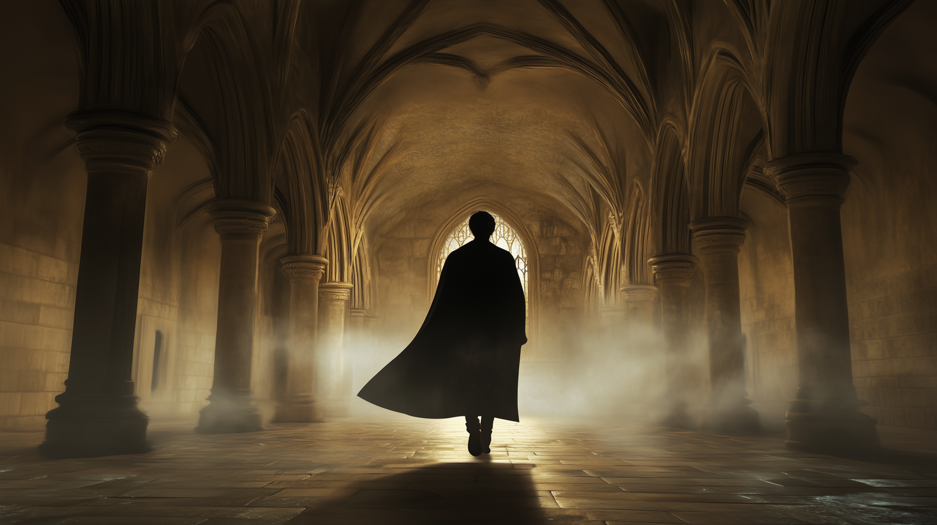The image captures a dramatic night scene inside a grand castle, with a man dressed in a flowing black cloak. His mid-length black hair drapes elegantly as he walks, creating an alluring atmosphere of mystery and adventure.