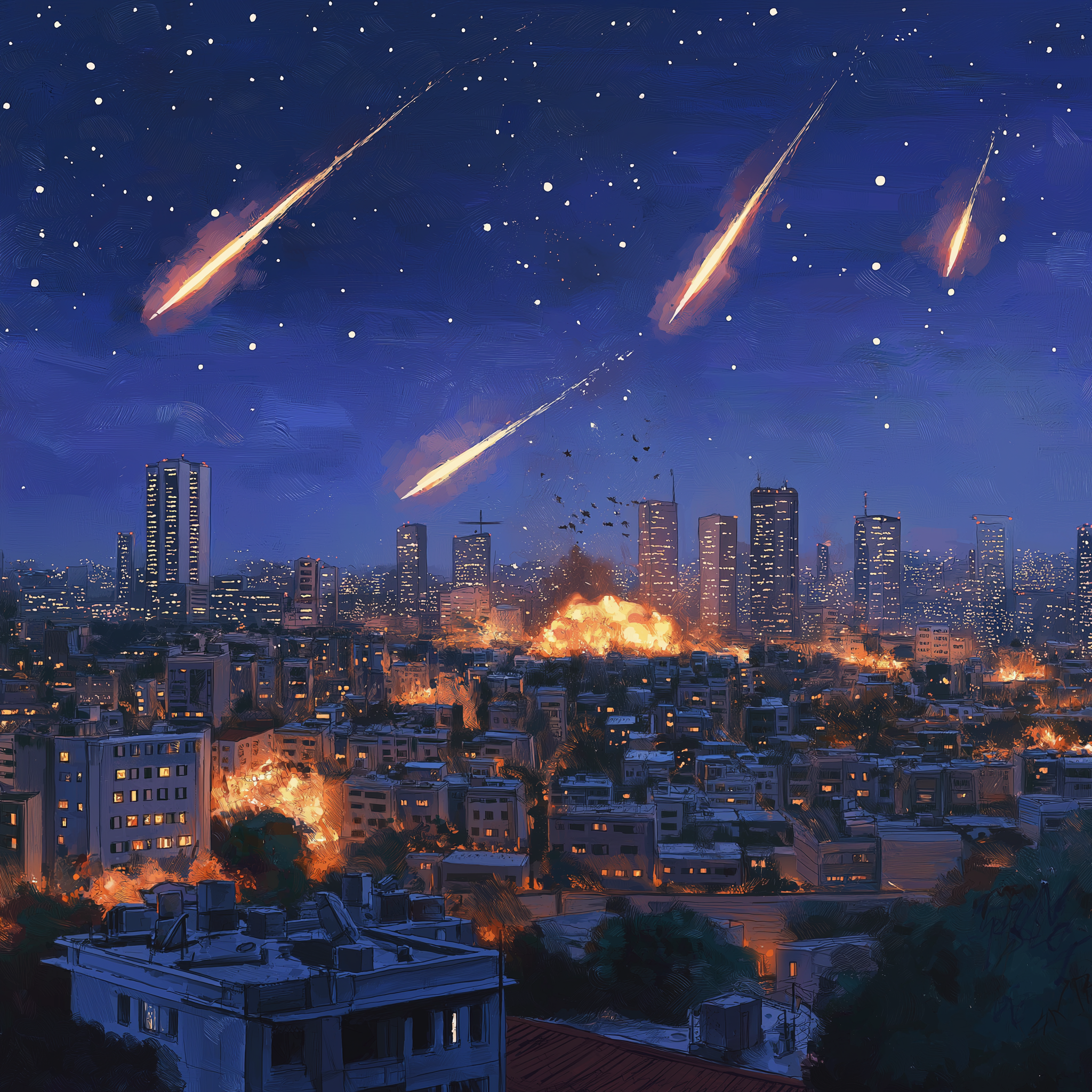 The image captures a dramatic night view of Tel Aviv's skyline illuminated by distant explosions. Rockets streak across the sky, resembling shooting stars, while fire flickers in various locations across the cityscape.