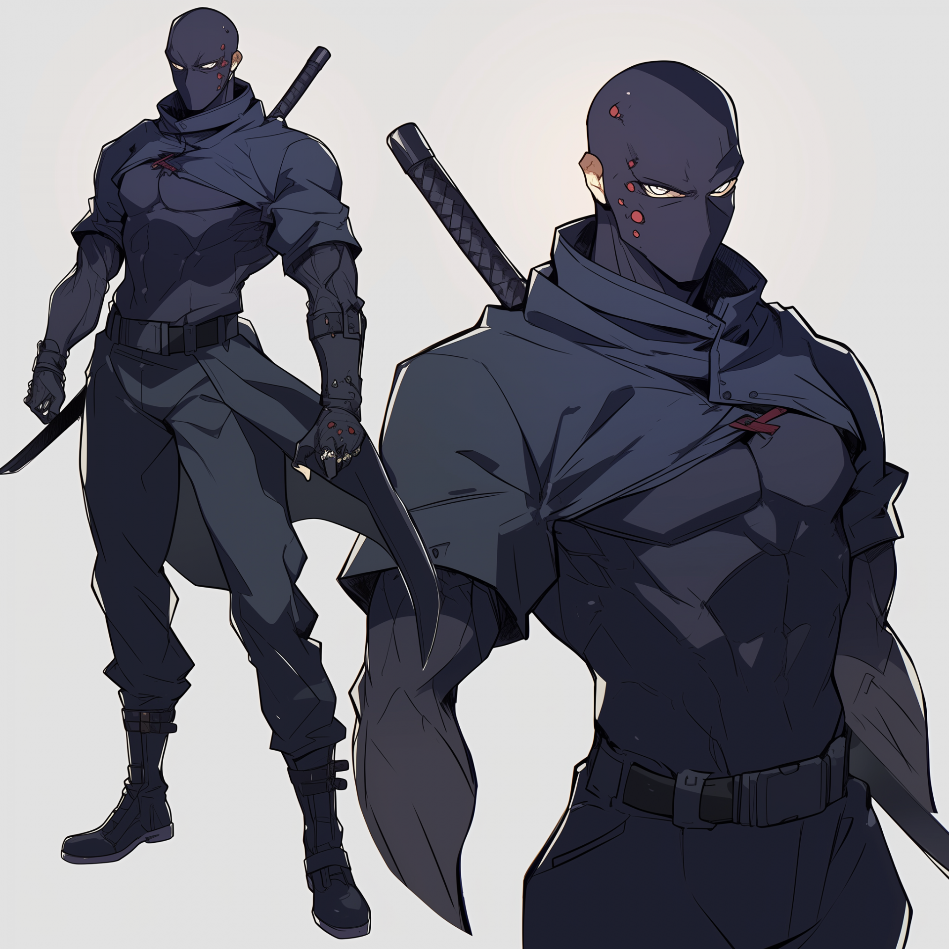 The image features a stylized male anime character with a striking appearance, blending elements from iconic figures. He stands confidently, showcasing his toned physique and martial arts prowess, dressed in a sleek ninja outfit that exudes intensity and skill.
