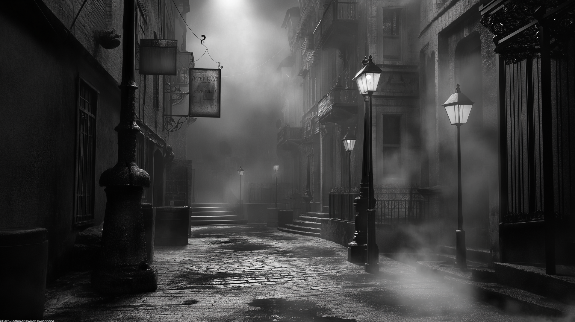 This image showcases a moody alleyway captured in black and white, evoking a film noir atmosphere. The scene features dramatic pools of light from street lamps cutting through the fog, creating a cinematic feel.