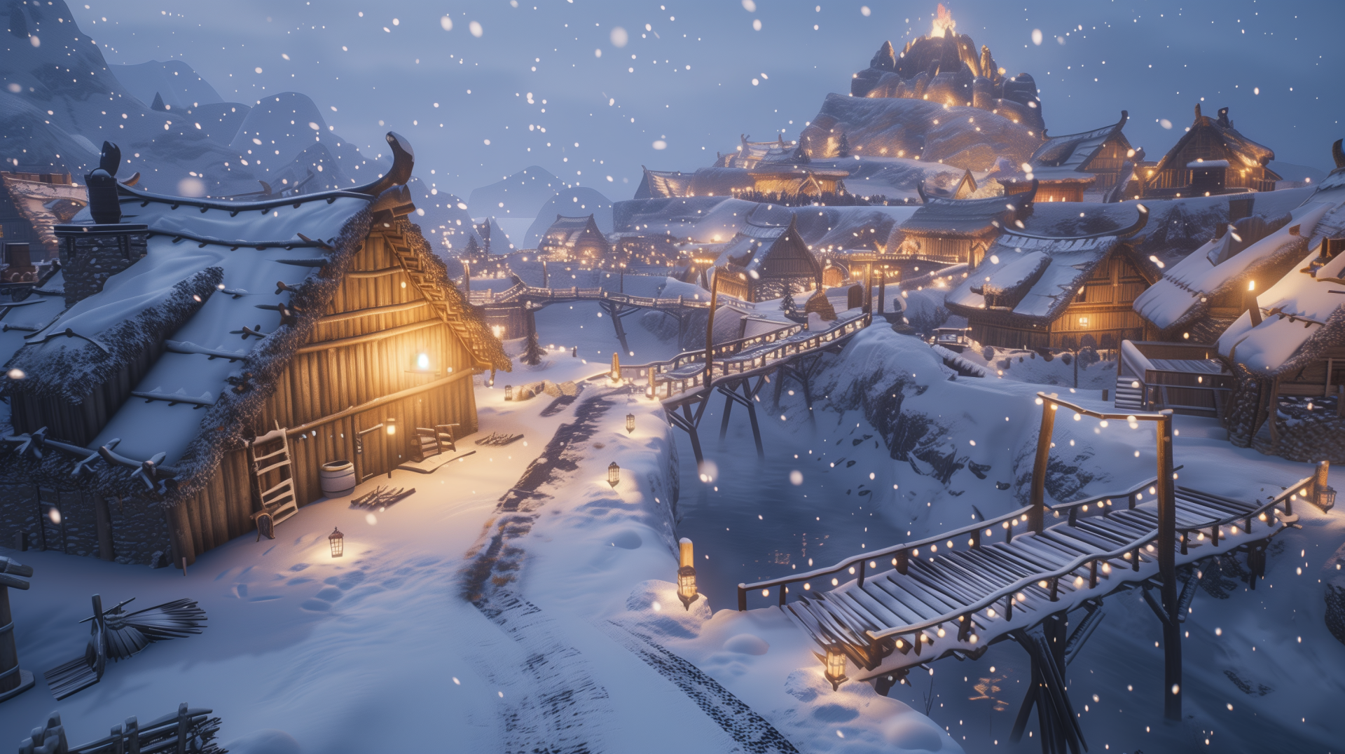 This image portrays a detailed map of a Viking village blanketed in snow, showcasing wooden longhouses and a fortified structure on a hill. The atmosphere is epic, with sled tracks and glowing torches providing hints of recent activity in this winter wonderland.