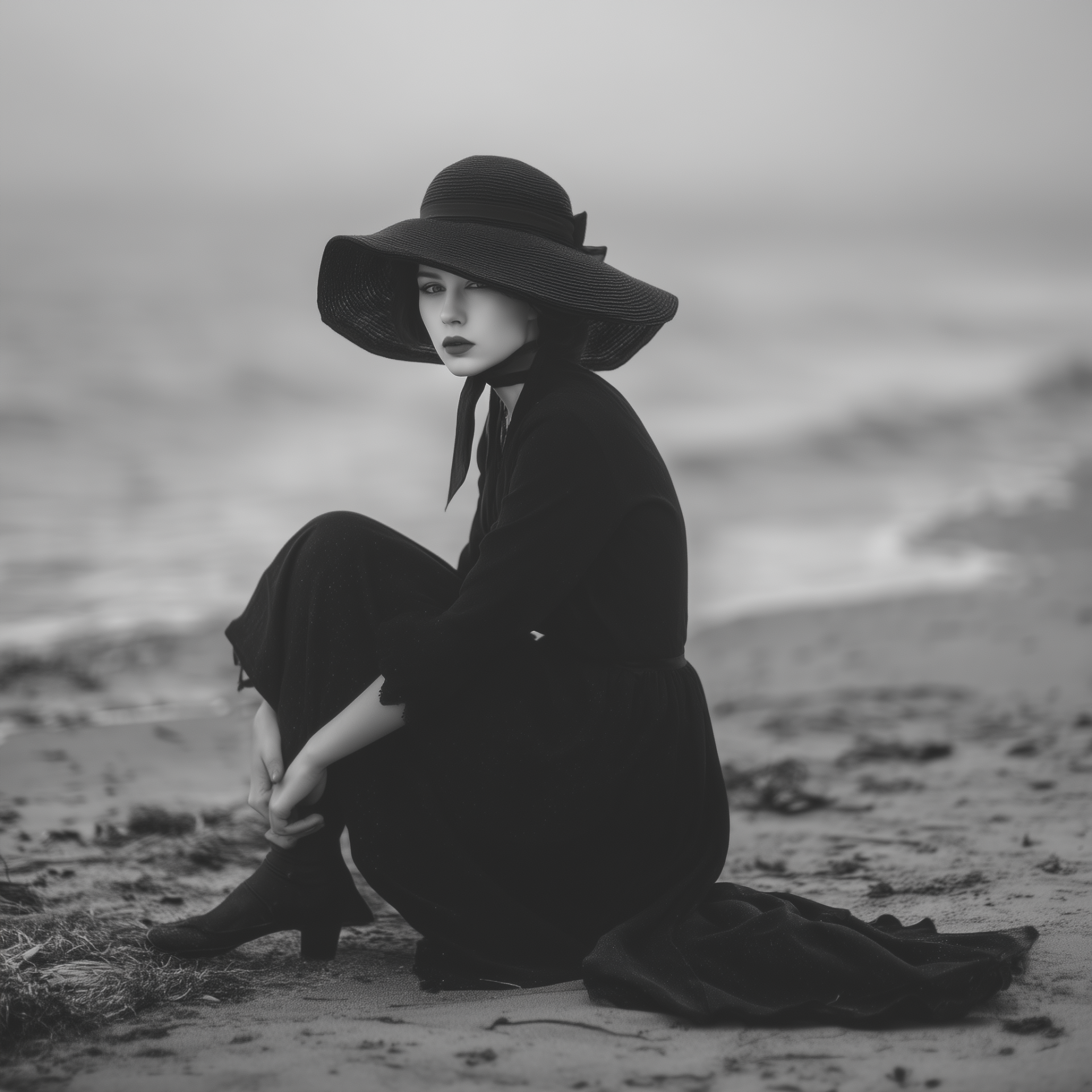 The image depicts a pale girl sitting on a grey, gloomy seashore, embodying shyness with a quick glance at the camera. Dressed in a black 1920's dress with a large hat, the hyper-realistic black and white composition highlights a sense of solitude and nostalgia.