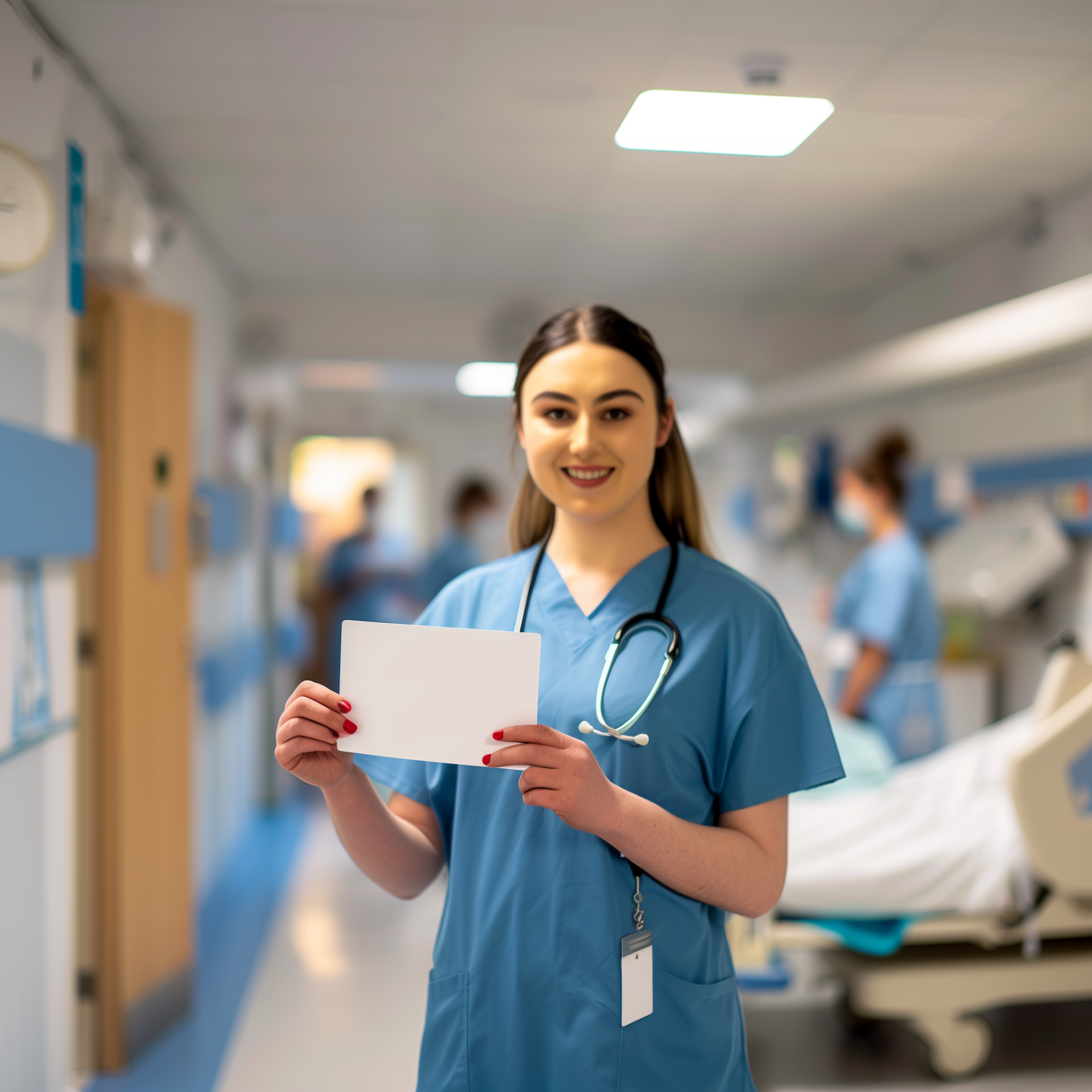 This image features a smiling nurse in a clean, bright hospital room, holding a large white card. The atmosphere is professional yet warm, embodying the caring nature of healthcare workers.