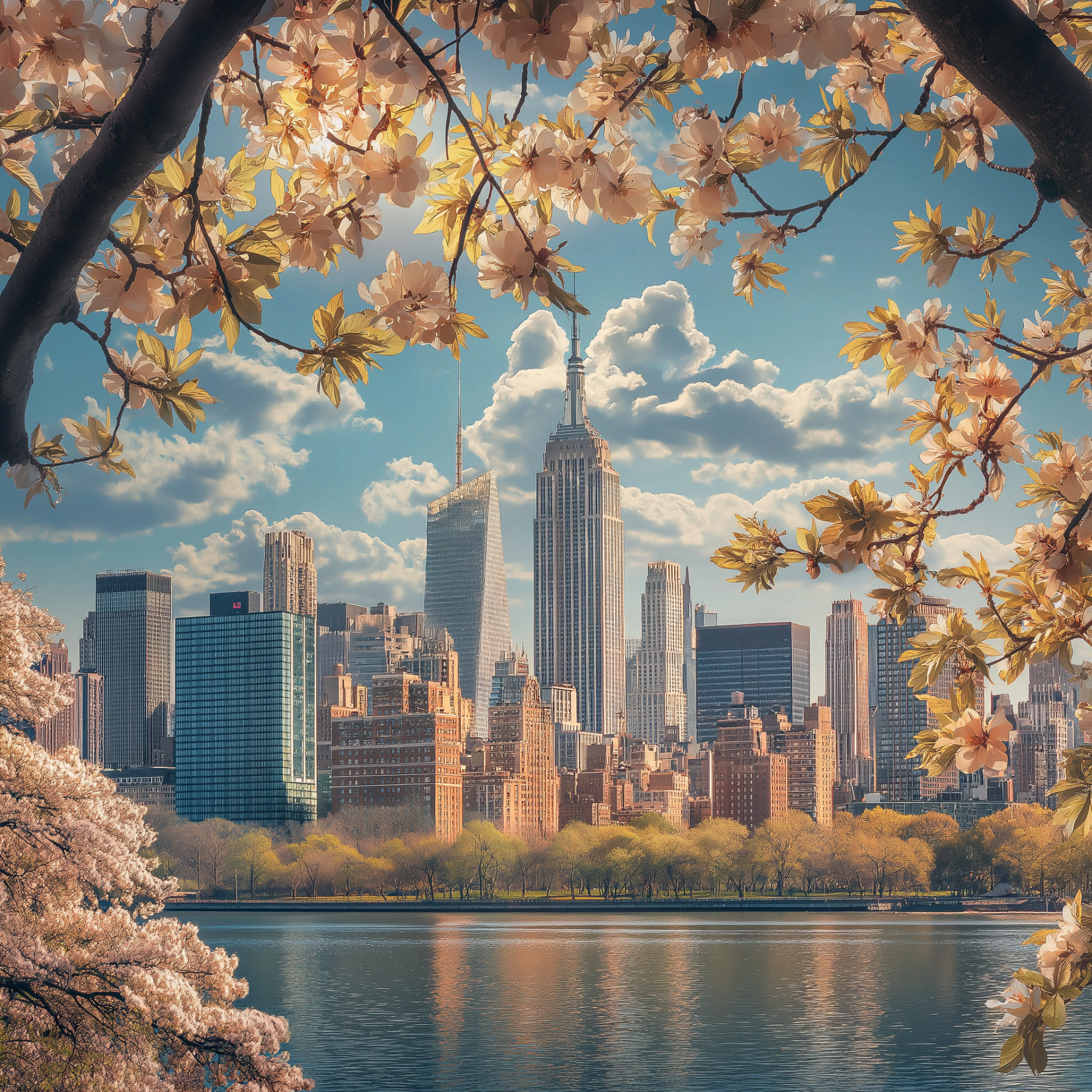 This image captures a distant view of the New York skyline, framed by vibrant spring foliage and blooming flowers. The bright blue sky dotted with fluffy clouds adds a cheerful and uplifting atmosphere to the scene.