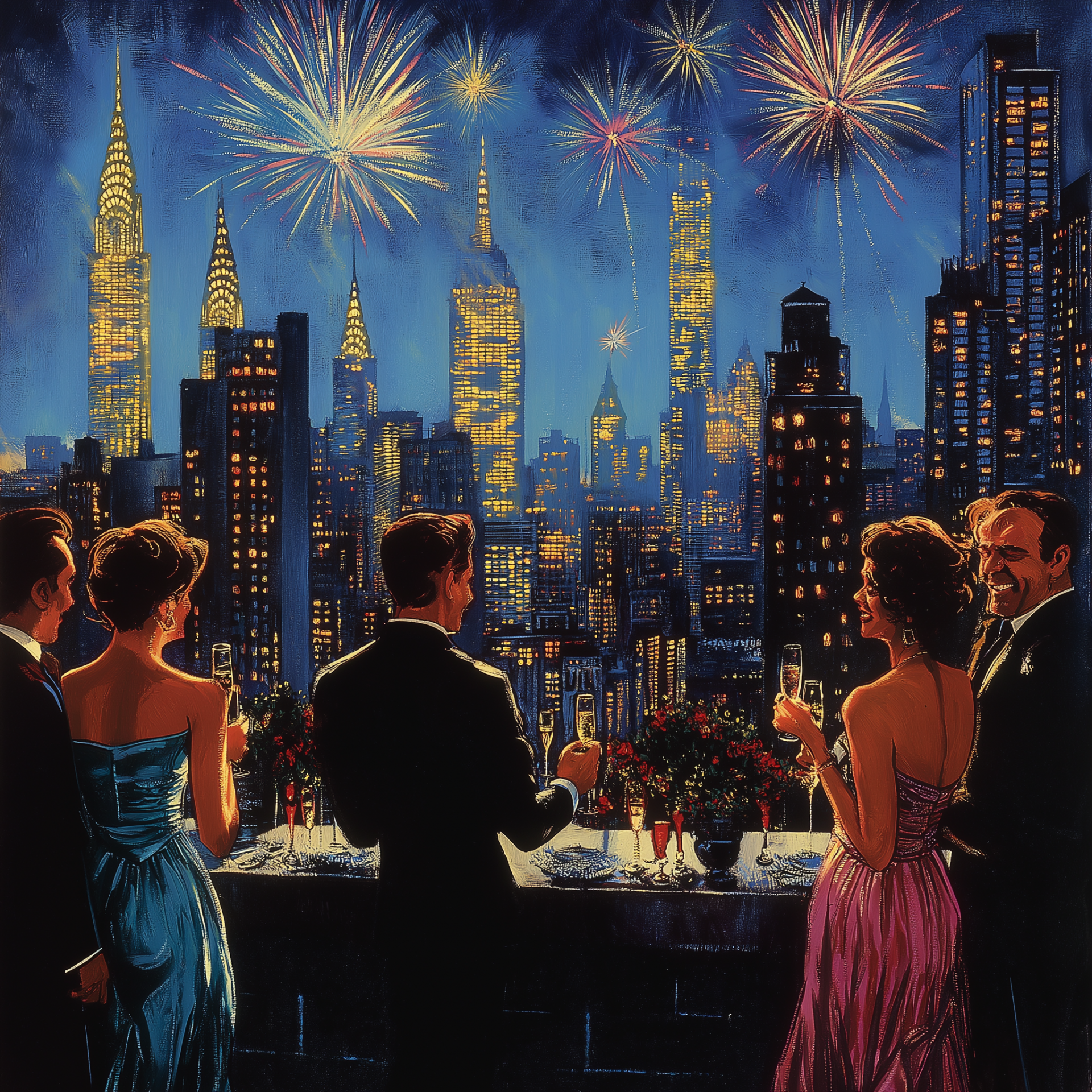 The scene captures a lively New Year's Eve celebration in a 1990s New York City rooftop setting. The illuminated skyline and colorful fireworks create a festive atmosphere, complemented by elegantly dressed individuals enjoying the night.