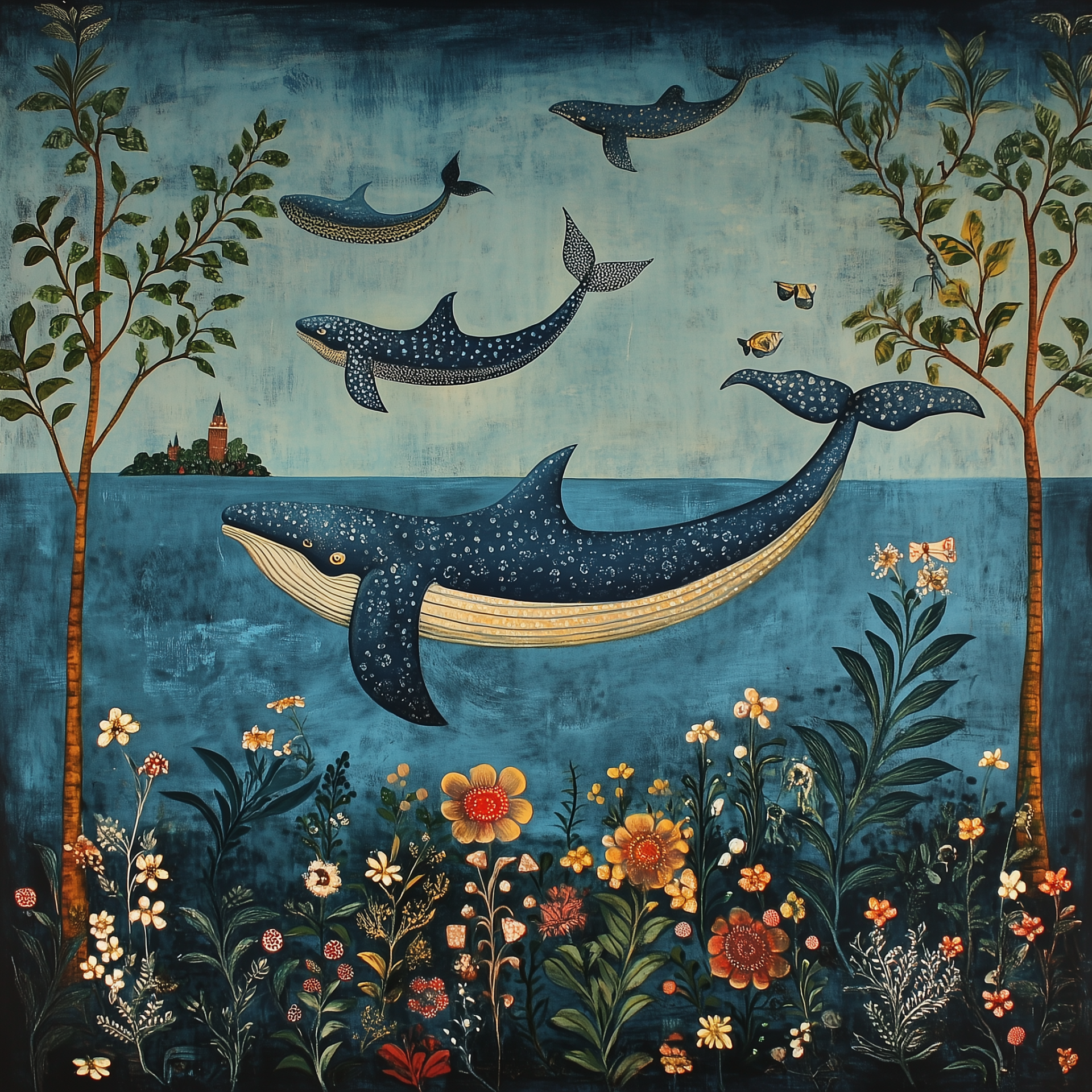 The image features a vibrant and lush backdrop, showcasing a series of whale flukes emerging from a colorful sea. The style reflects a dreamlike quality with bold colors and an imaginative representation, reminiscent of Henri Rousseau's work.