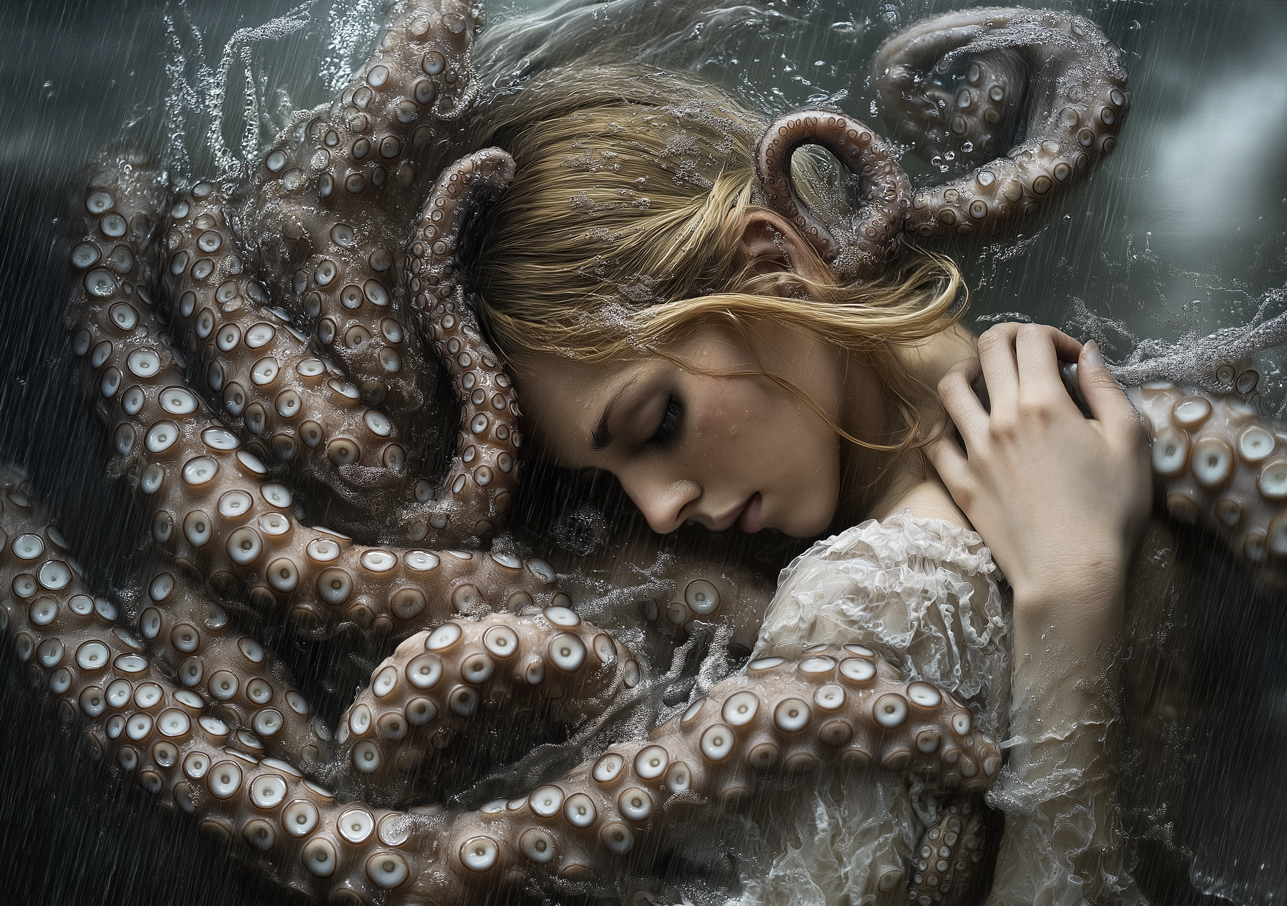 This striking image portrays a beautiful woman wrapped in the tentacles of an octopus, set against a backdrop of dramatic lighting. The photorealistic style enhances the emotional intensity of the scene, creating a captivating and surreal atmosphere.