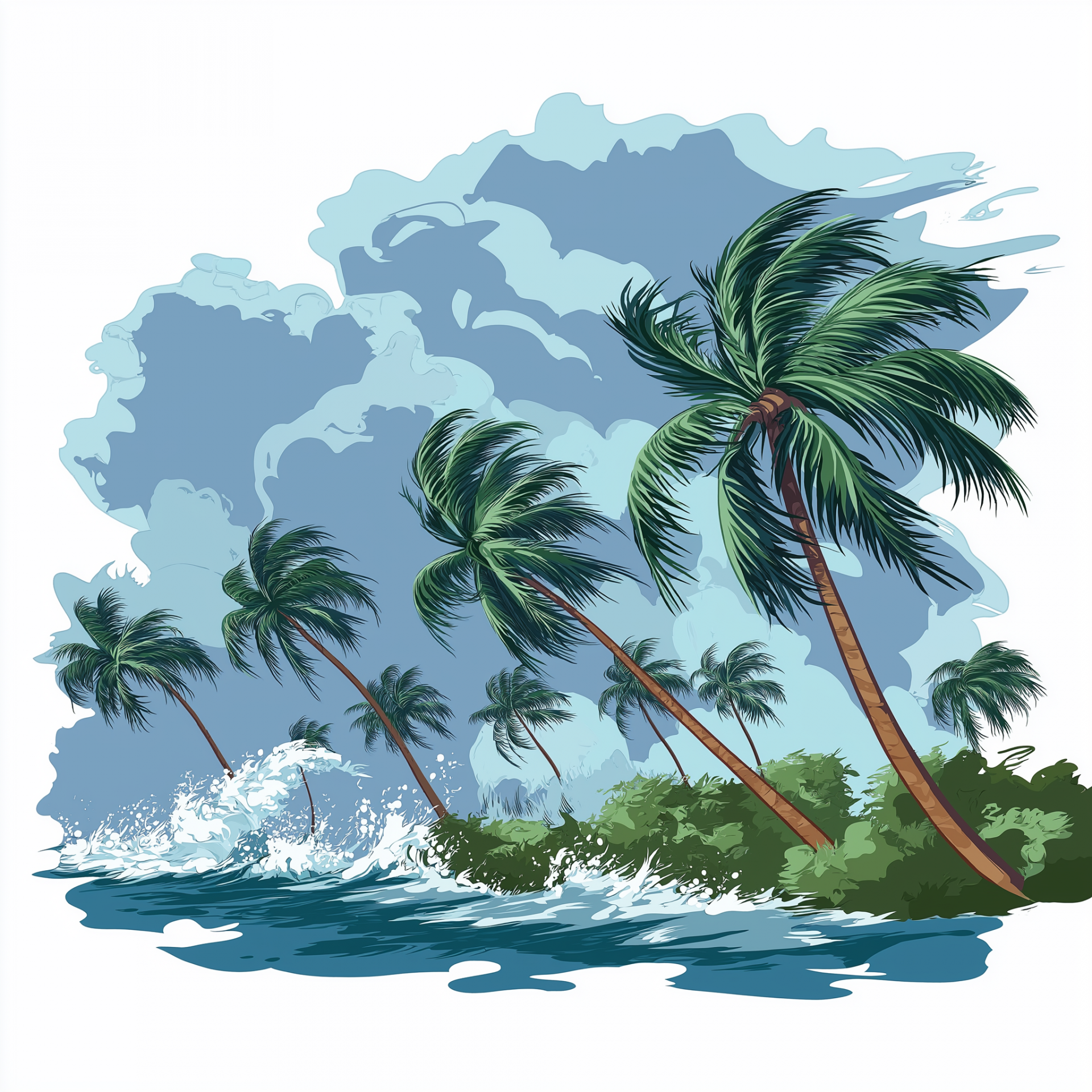 This illustration depicts a dramatic scene of palm trees bending under the force of a strong ocean monsoon. The vibrant colors and exaggerated elements convey a sense of wild nature and extreme weather conditions.