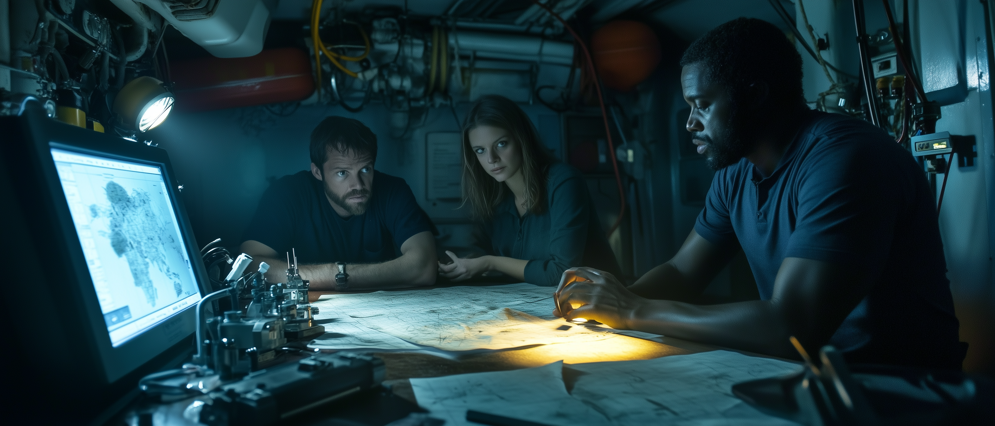 A dimly lit cabin on a research vessel, where a group of people are gathered around a table covered in nautical charts and maps. The atmosphere is focused and intense as they work together surrounded by navigation equipment and computer screens.