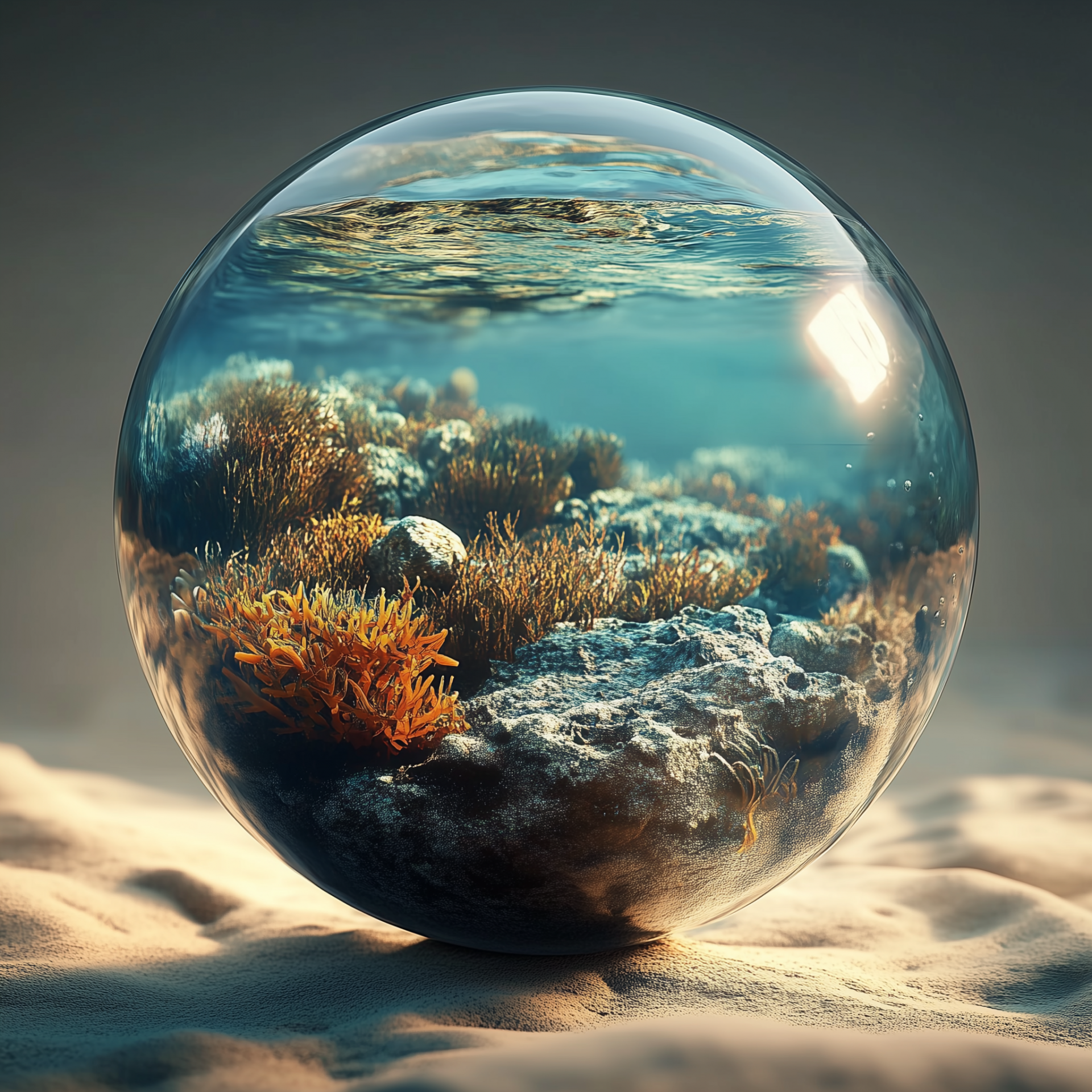 The image showcases a large bubble filled with oceanic soil, creating a captivating underwater scene. The photorealistic details and vibrant colors give a sense of depth and serenity, transporting the viewer to an enchanting aquatic realm.