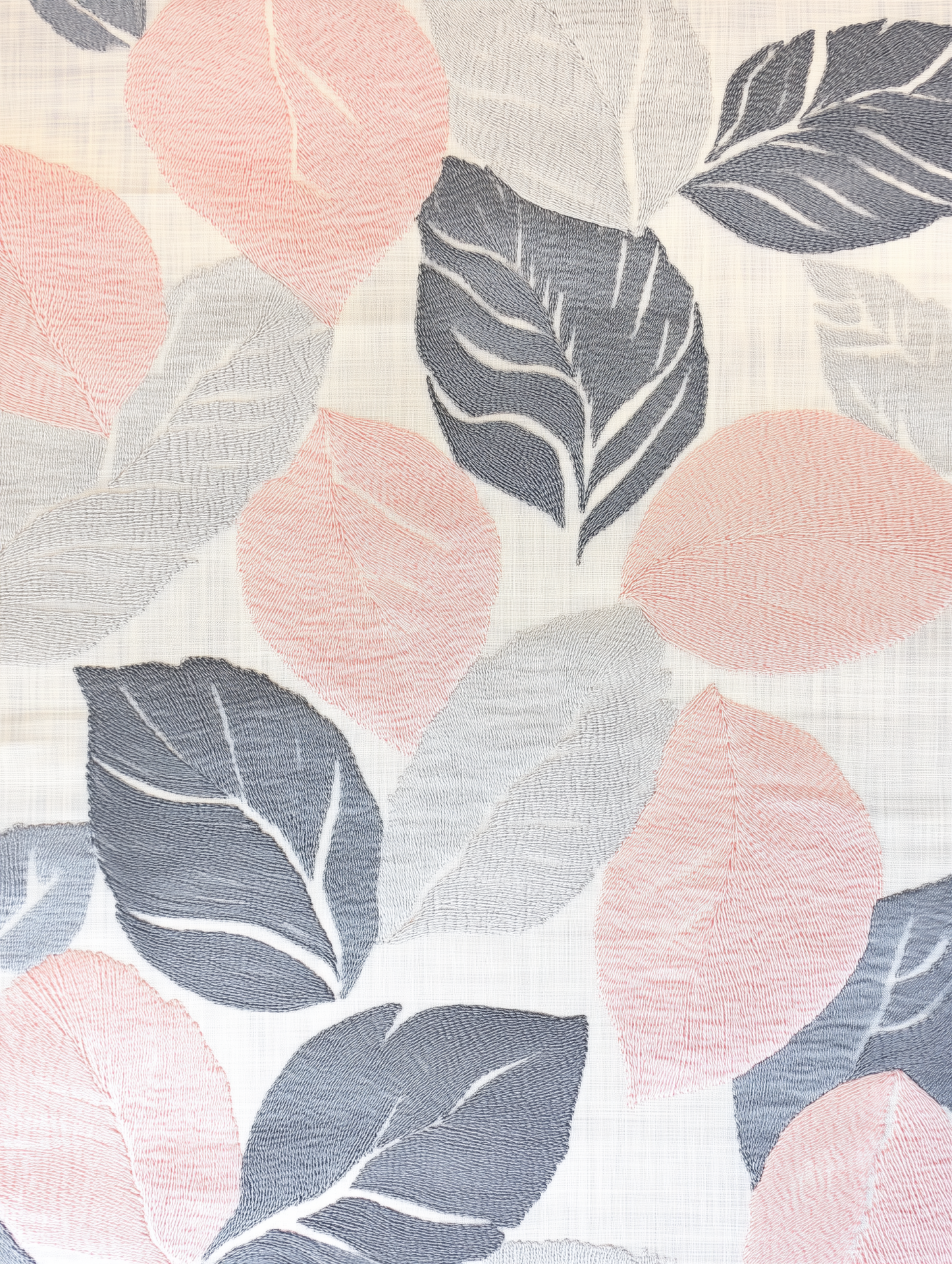 This intricate embroidered fabric features a soft design with large leaves and organic shapes. The light pink and grey colors create a gentle and natural feel, reminiscent of the ocean's beauty.