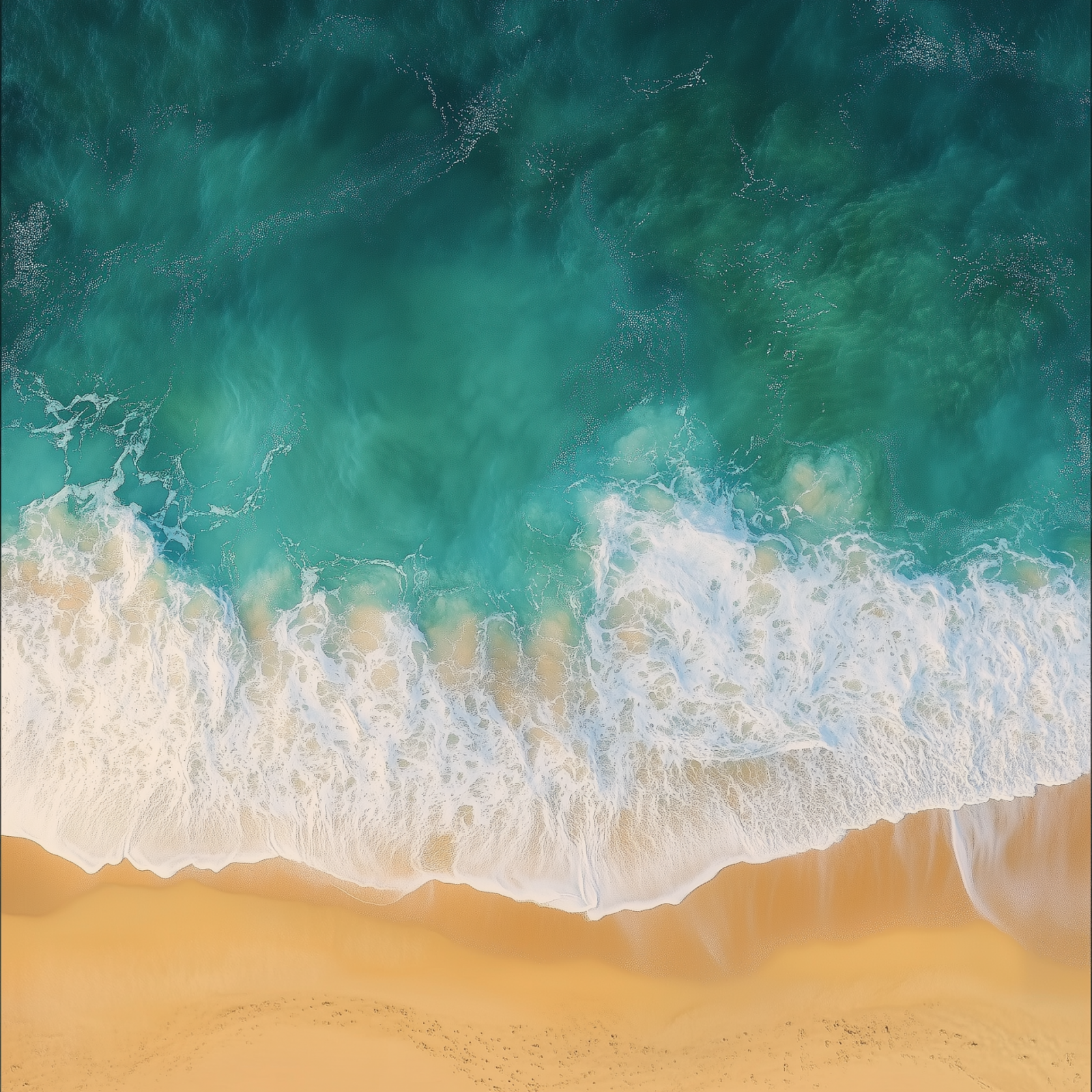 This image presents a breathtaking aerial view of the ocean meeting a sandy beach. The turquoise water gracefully ripples and foams as it crashes onto the golden shore, creating a tranquil and elegant scene.