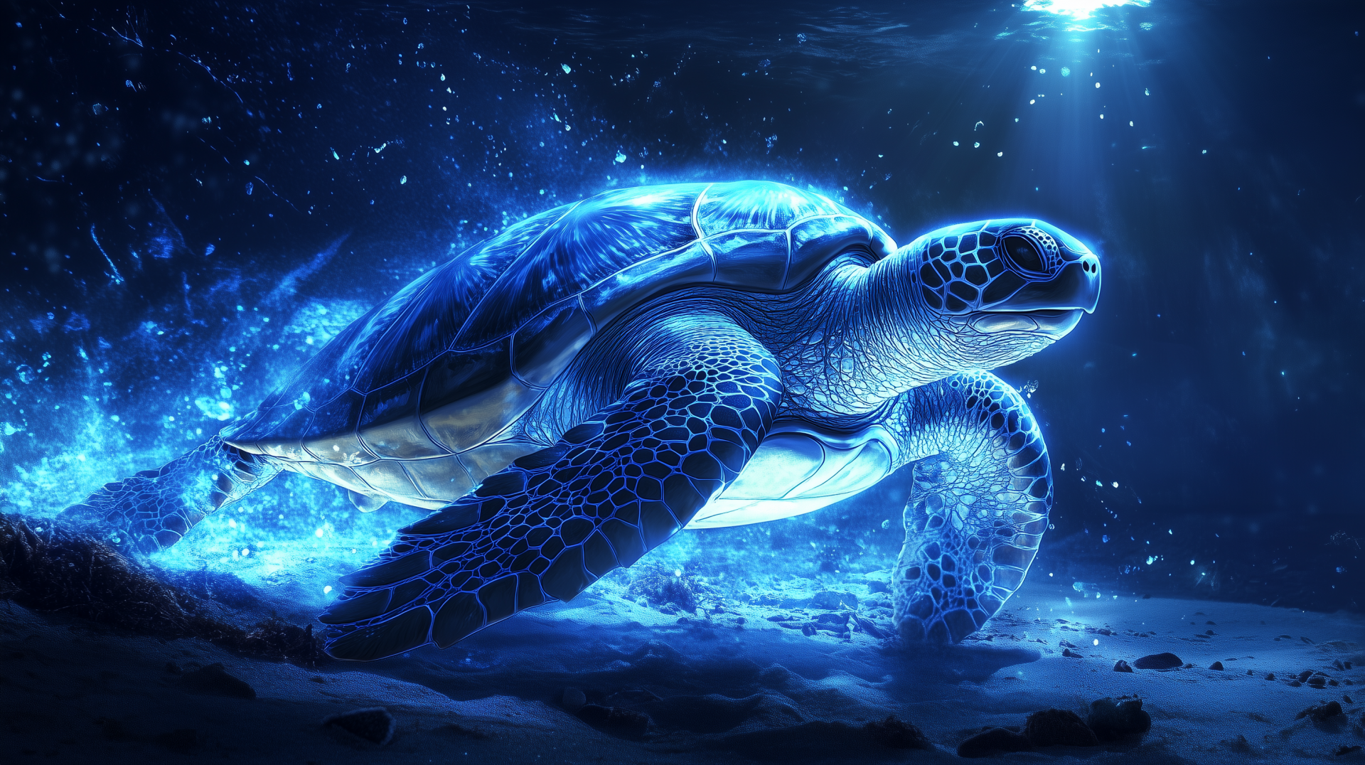 A majestic giant turtle quietly swims through the open sea, bathed in a brilliant deep blue aura. The serene moonlight enhances its powerful presence, creating an atmosphere of peace and wisdom around it.