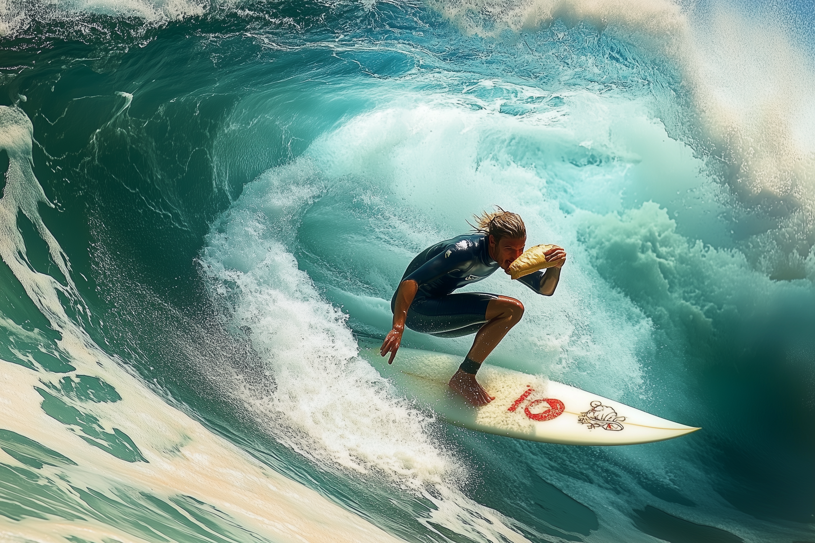This realistic photograph captures a surfer positioned in the center of a powerful wave, calmly eating a sandwich. The image conveys a sense of adventure and tranquility, blending the thrill of surfing with a leisurely moment.