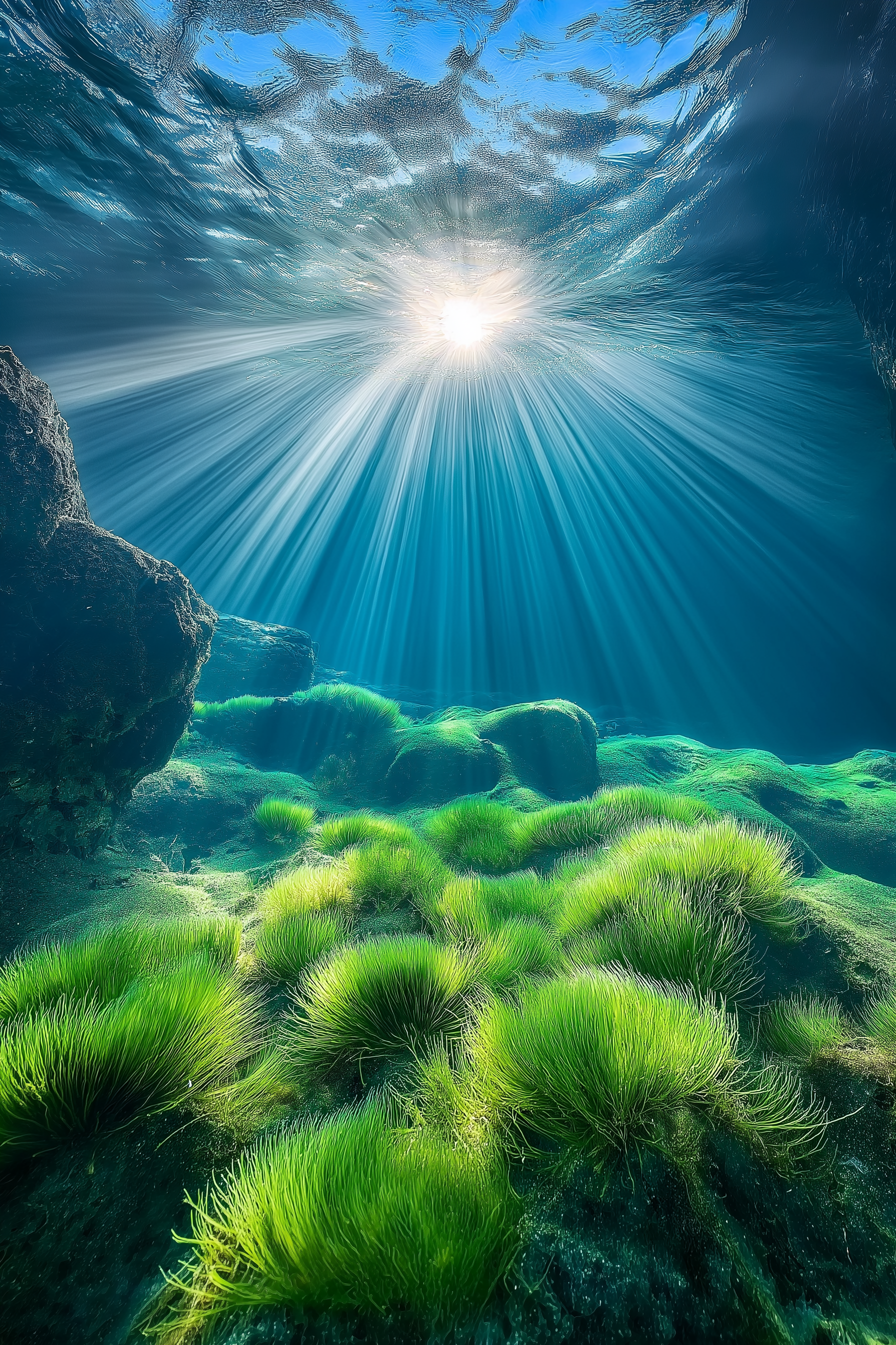 This image captures a beautiful underwater grass bed illuminated by sun rays streaming through the clear blue sea. The tranquil scene evokes a sense of peace and natural beauty as vibrant greens contrast with the cool blues of the water.