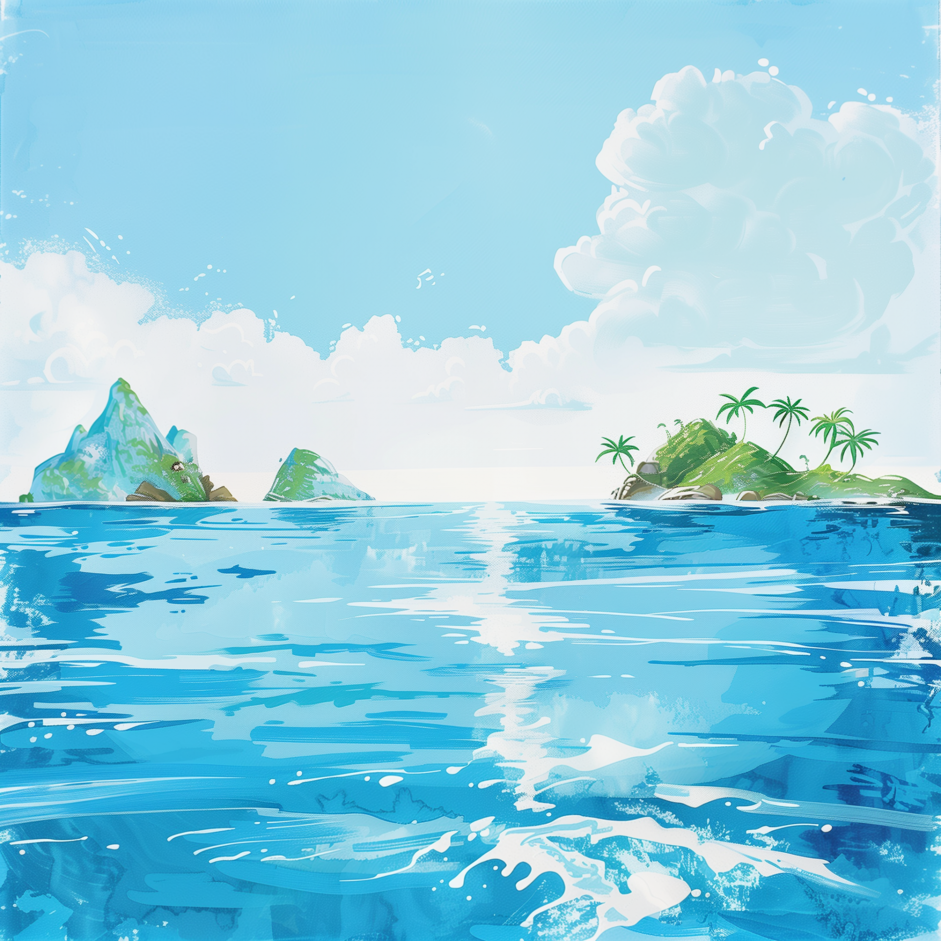 This illustration depicts a serene open ocean with pointy tropical islands scattered across the horizon. The water is rendered in a flat, messy watercolor style, evoking a whimsical and playful atmosphere.