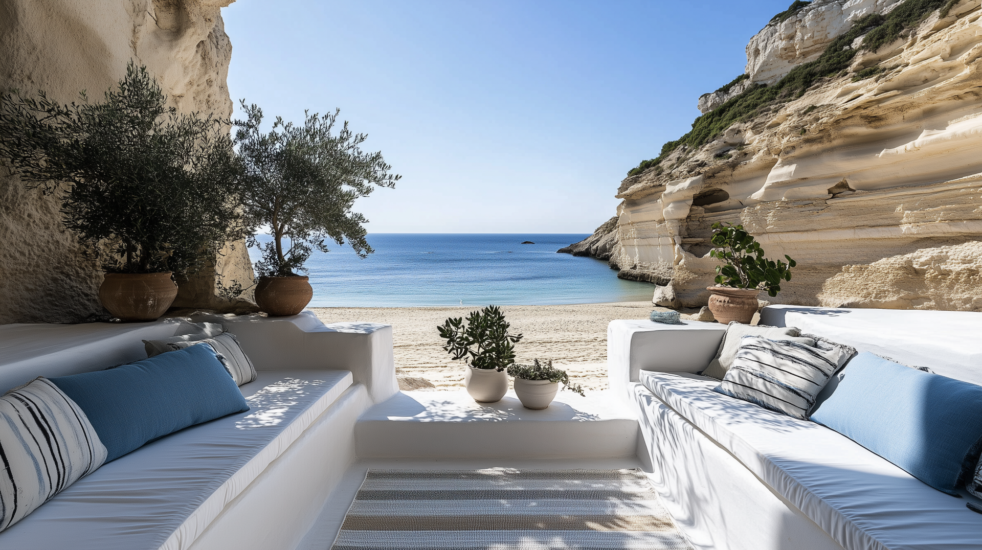 This image captures a serene view from a white stone balcony overlooking the azure ocean. The soft white and blue seating, along with potted plants and an olive tree, create a tranquil atmosphere against the backdrop of towering cliffs.
