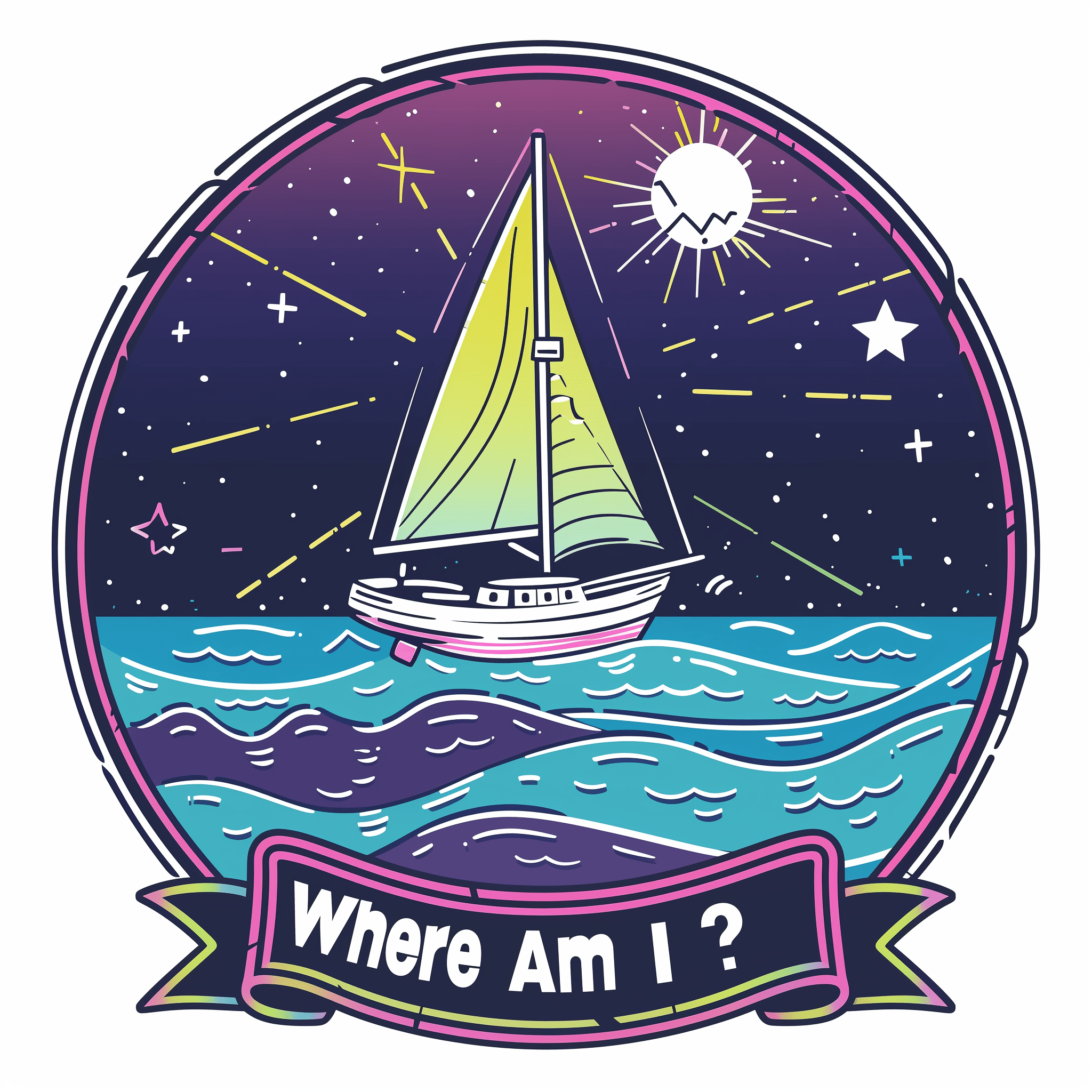 A minimalist circular logo style illustration of a sailboat sailing on the open ocean with a banner that reads 'Where Am I?'. The design features faded neon colors including blue, purple, pink, green, and yellow on a white background, giving a calm and serene vibe.