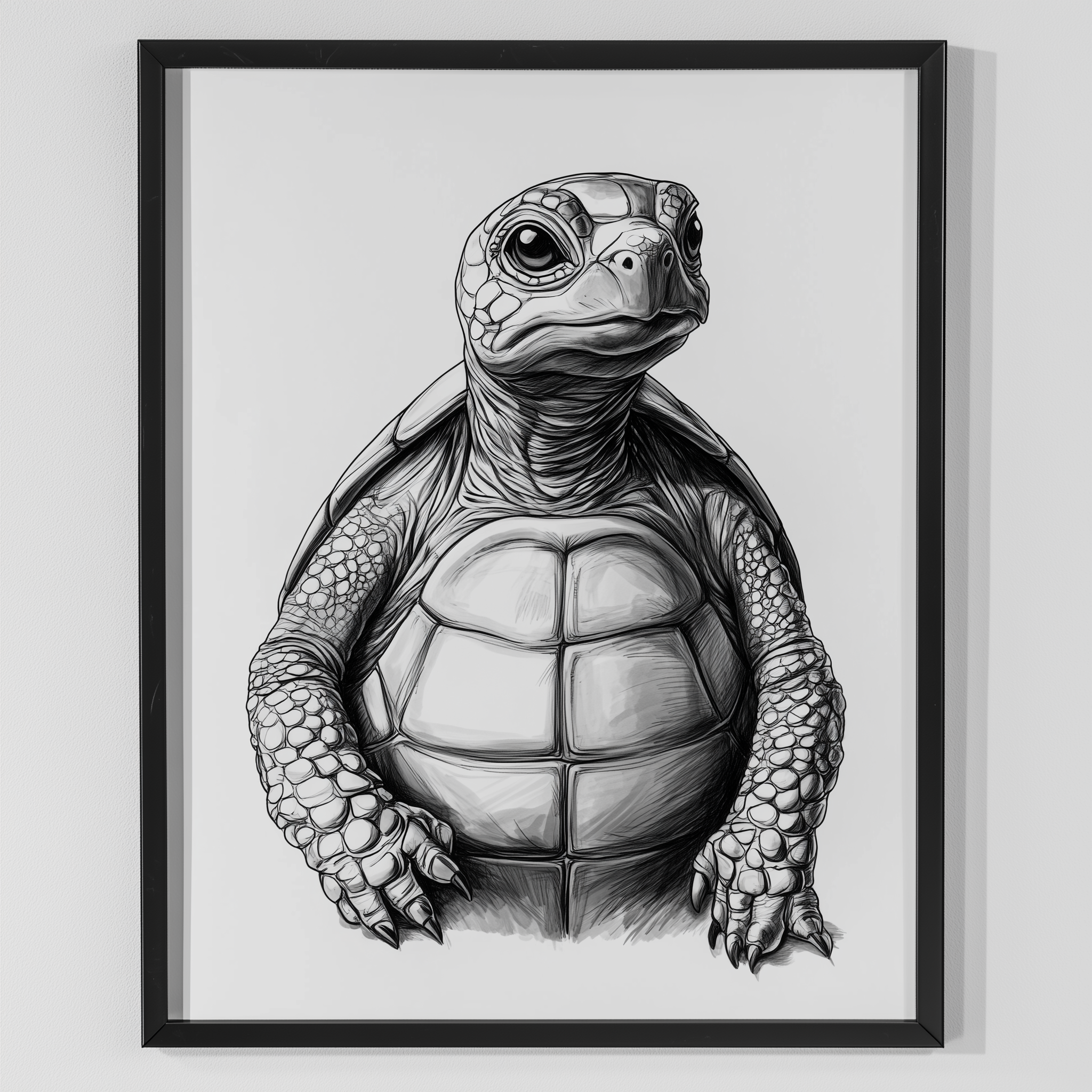 This illustration features a charming turtle depicted as an office worker in a whimsical sketch style. The turtle gazes directly at the viewer, with a framed portrait hanging on the wall enhancing the unique ambiance of the scene.