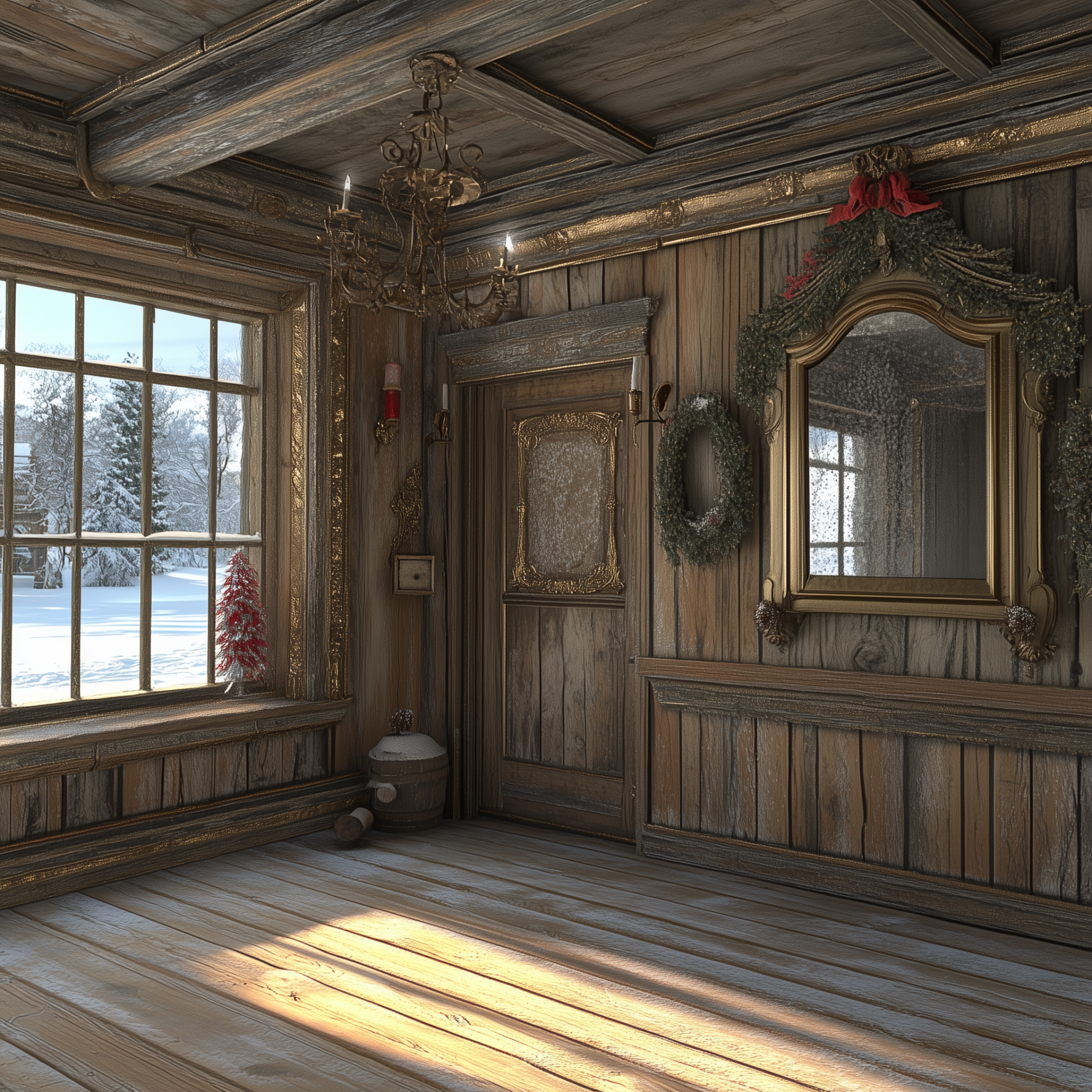 The image depicts the interior of a cozy 18th-century hut with a straight wall adorned with decorations. On the right, a large mirror reflects the snow falling outside the small window on the left, creating a warm yet wintry atmosphere.