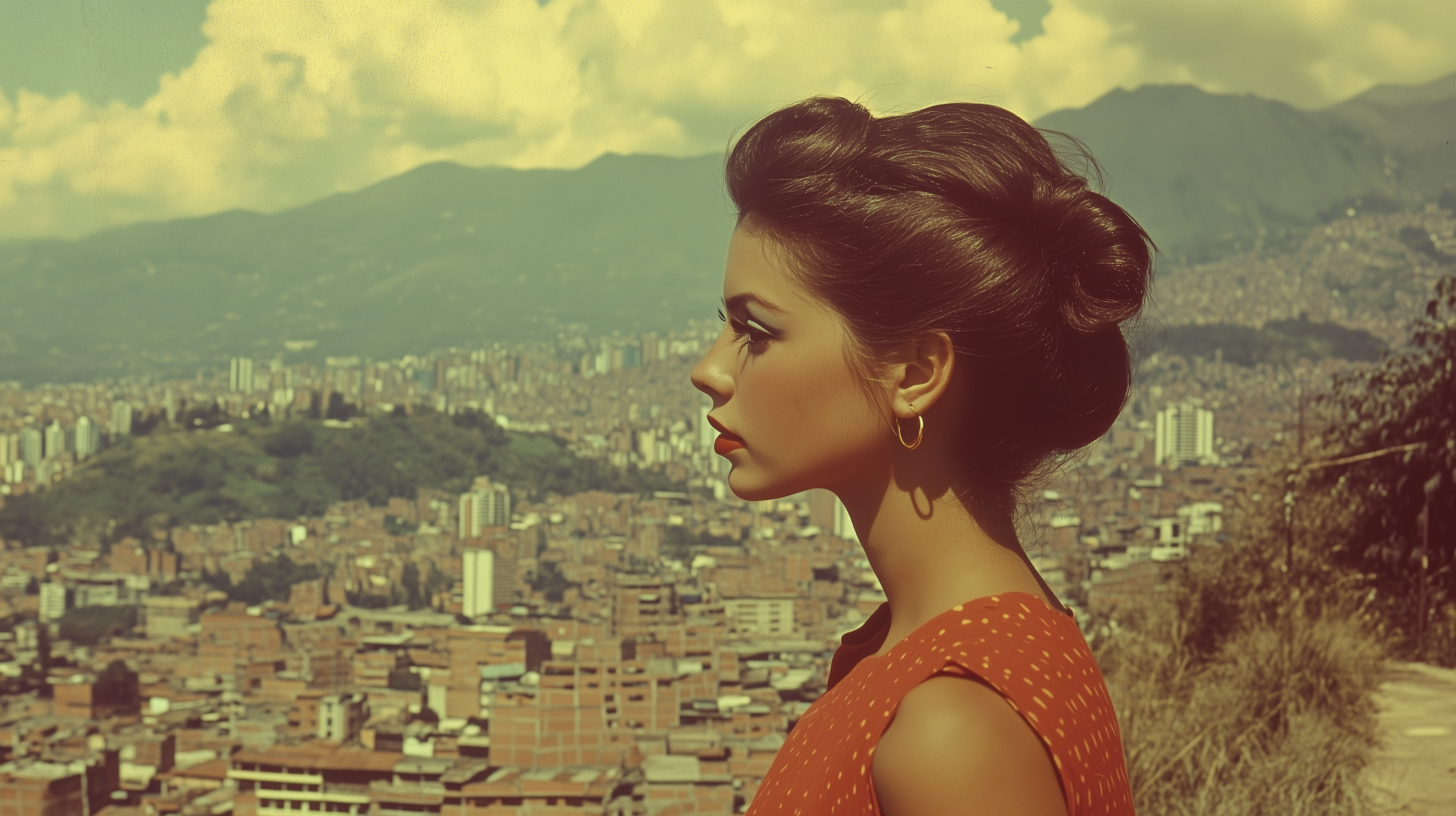 This image captures a nostalgic scene from Medellin, showcasing the charm of vintage Latin American fashion. The warm tones and classic details evoke a sense of history and cultural richness.
