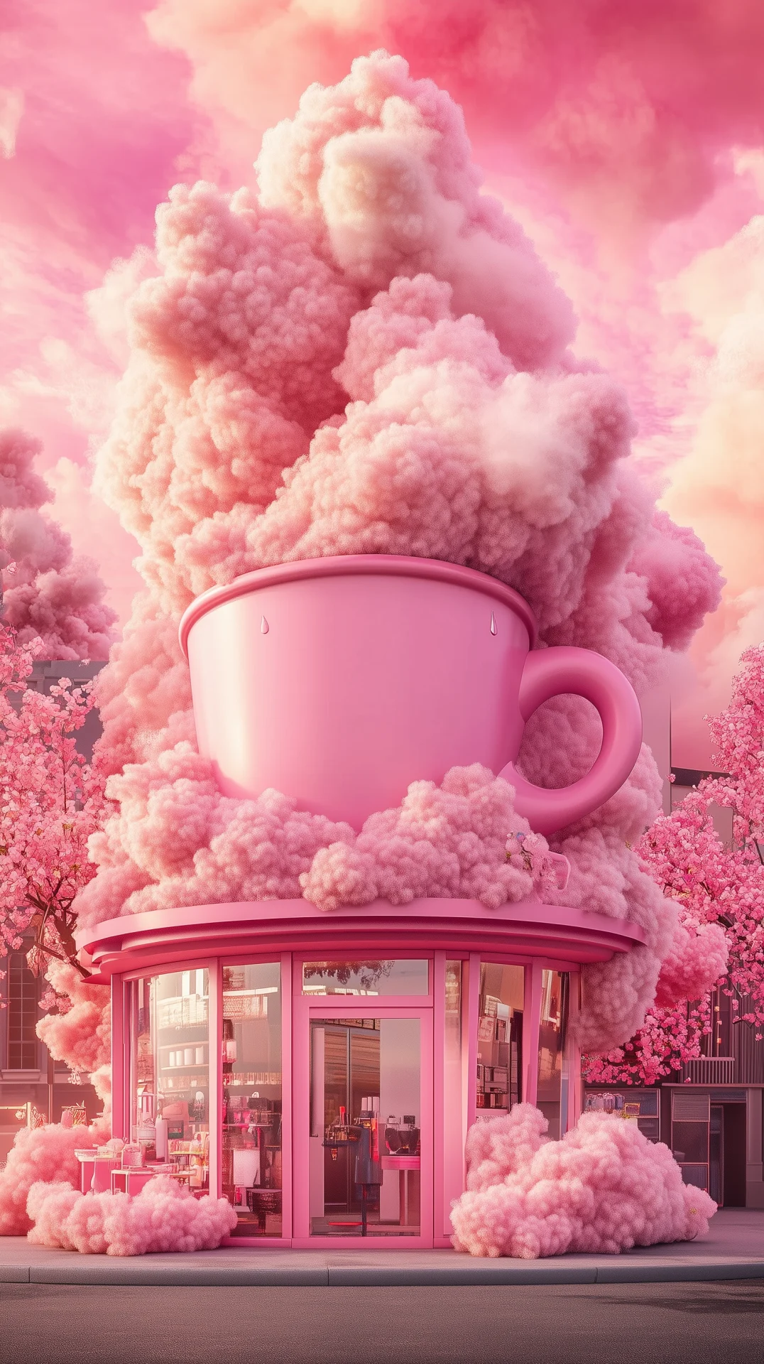 A miniature coffee shop housed in a flat container set on a solid concrete surface, featuring four glass windows, a door, and a slatted section on the right. Surrounding the container are tables under a canopy, creating a cozy outdoor ambiance.