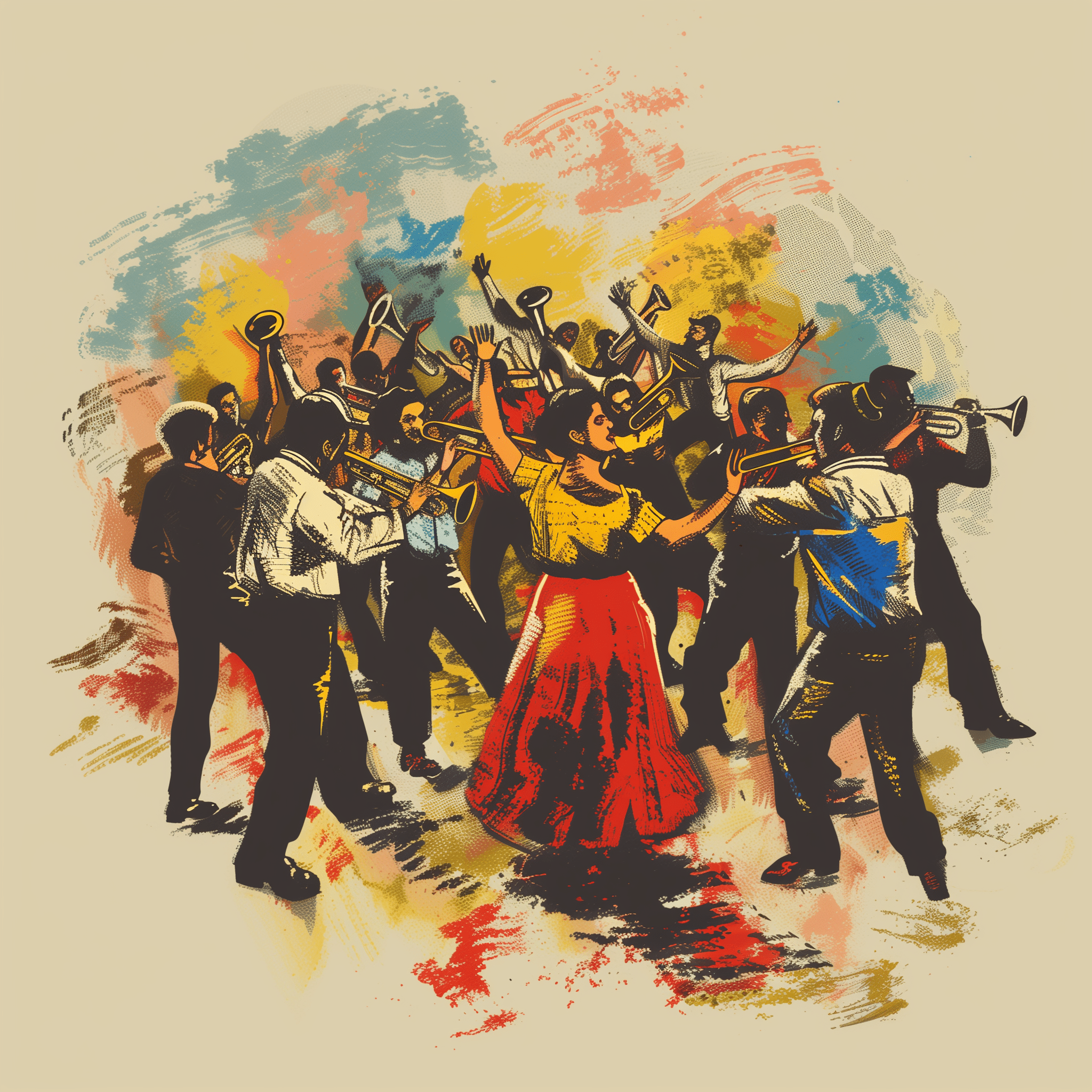 A lively retro drawing style scene of a Bukovina Balkan Beats concert dance party, featuring happy people dancing in a design-oriented setting. The image includes a Balkan brass band in the background, adding to the vibrant and energetic atmosphere.
