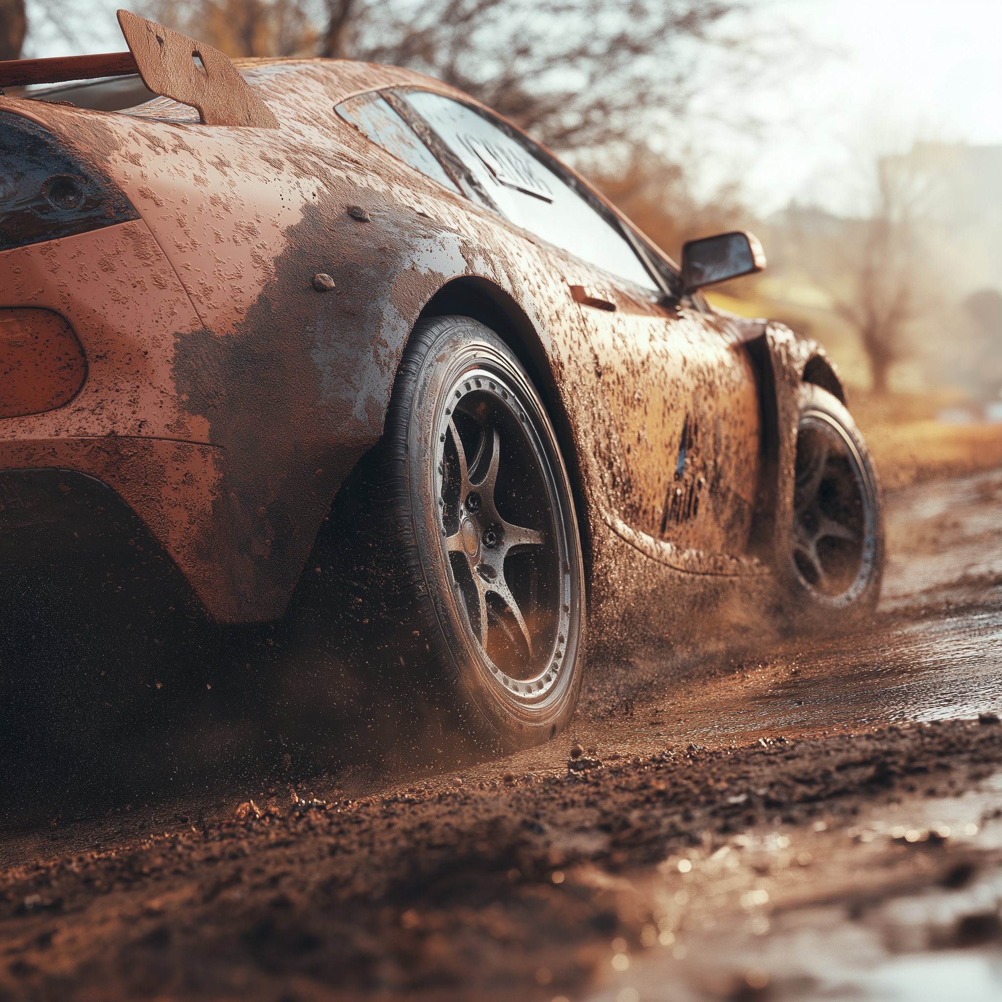 This image showcases a rugged car covered in dirt and mud, creating a stark contrast with its sleek, shiny wheels. The natural lighting emphasizes the rough texture of the vehicle against the pristine finish of the wheels, set against a dusty outdoor backdrop.