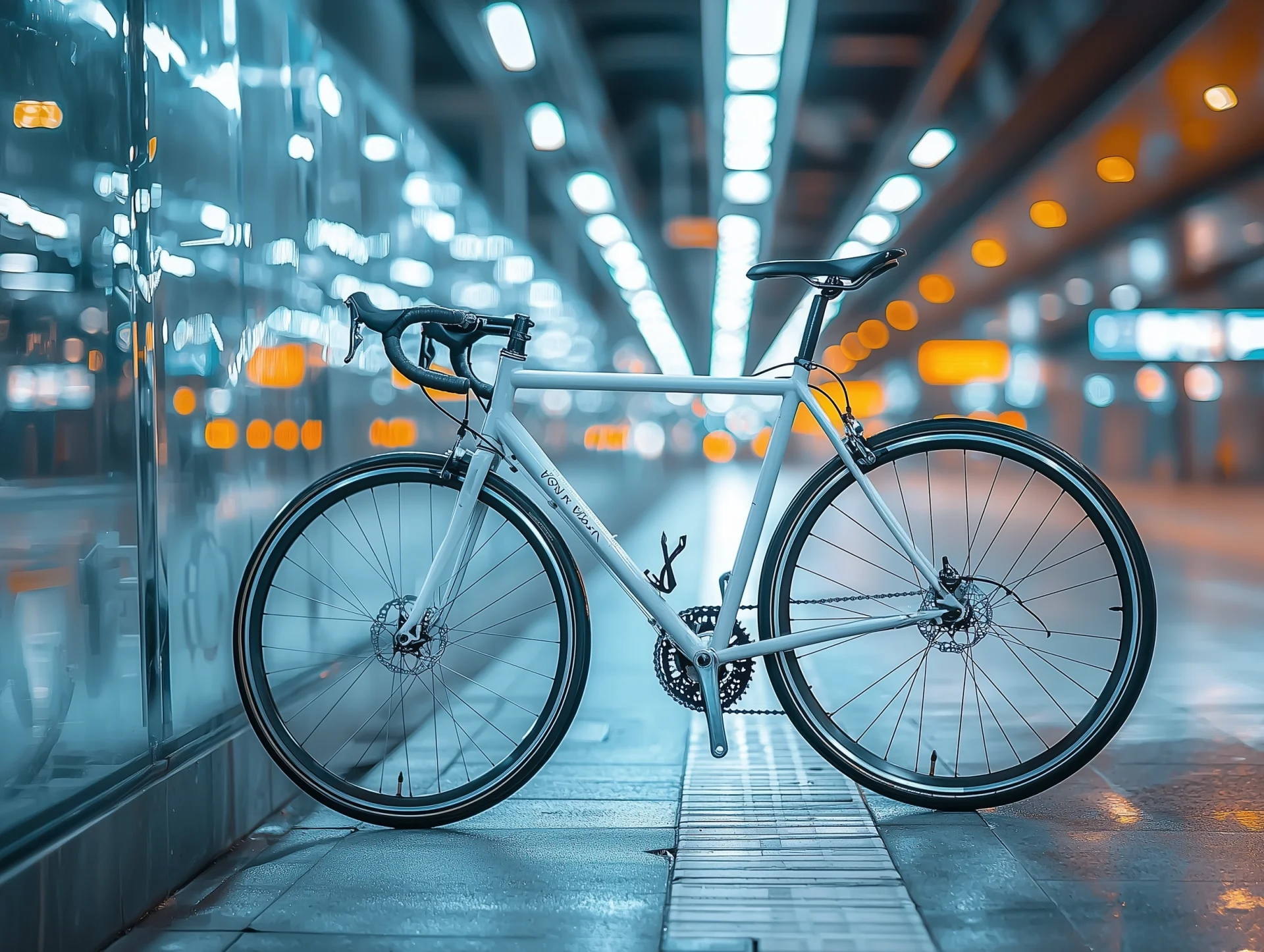 A cyclist stands confidently with their road bike, highlighting the fusion of style and functionality. The sleek, minimalist outfit enhances the dynamic vibe of outdoor cycling.