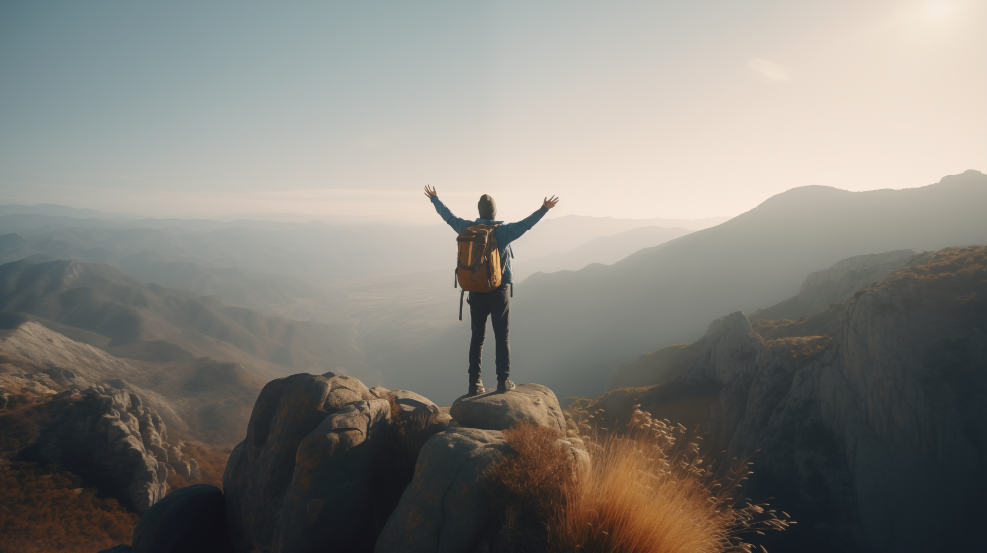 The image captures a fit hiker standing confidently on the edge of a cliff, arms stretched wide as they embrace the expansive horizon. The dynamic scene showcases the natural beauty and exhilarating sense of freedom amidst the outdoor environment.